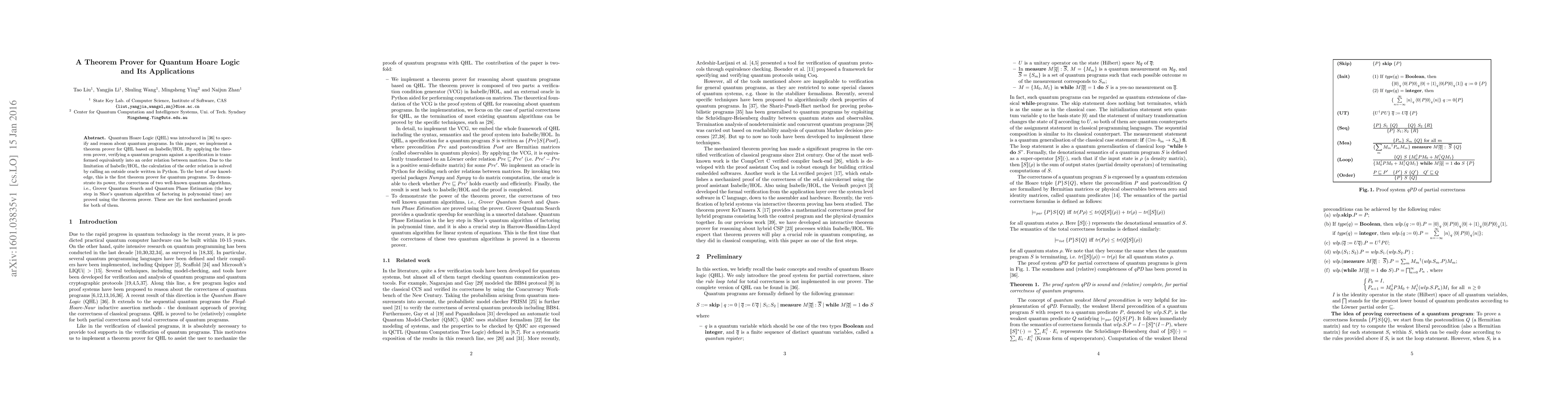 This paper presents a theorem prover for Quantum Hoare Logic (QHL) implemented in Isabelle/HOL, with an external Python oracle to handle matrix order relations. It demonstrates the prover's effectiveness by providing the first mechanized proofs for Grover's Quantum Search and Quantum Phase Estimation algorithms.