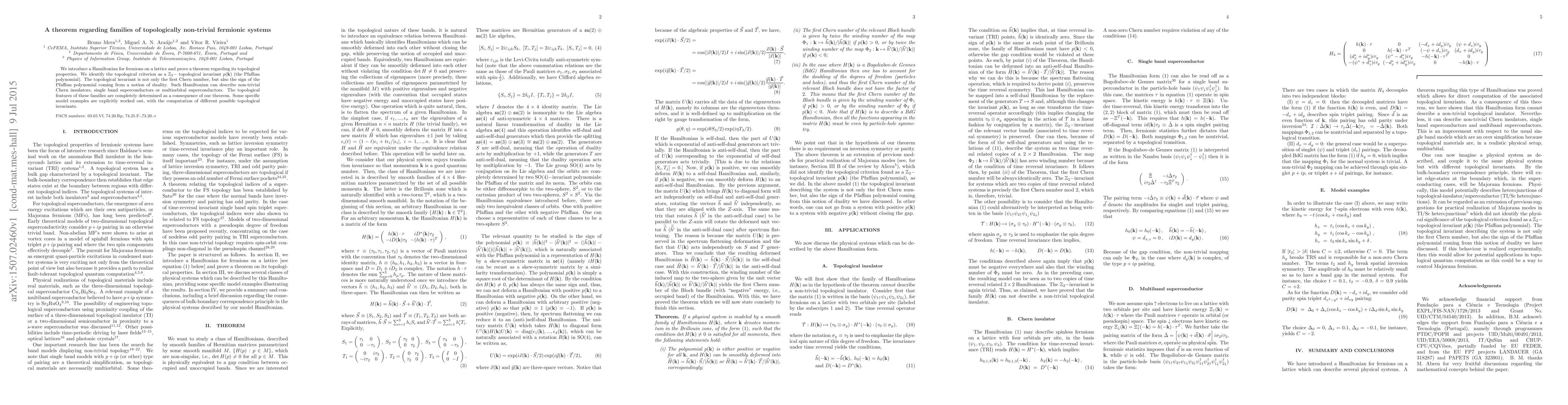 We introduce a Hamiltonian for fermions on a lattice and prove a theorem regarding its topological properties. We identify the topological criterion as a $\mathbb{Z}_2-$ topological invariant $p(\textbf{k})$ (the Pfaffian polynomial). The topological invariant is not only the first Chern number, but also the sign of the Pfaffian polynomial coming from a notion of duality. Such Hamiltonian can describe non-trivial Chern insulators, single band superconductors or multiorbital superconductors. The topological features of these families are completely determined as a consequence of our theorem. Some specific model examples are explicitly worked out, with the computation of different possible topological invariants.