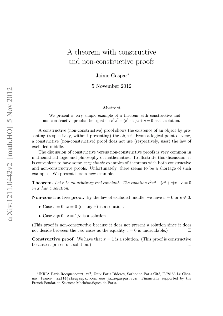 Summary: This paper explores a theorem demonstrating both constructive and non-constructive proofs for the equation c^2 x^2 - (c^2 + c)x + c = 0, showing that it has a solution through different proof methodologies.