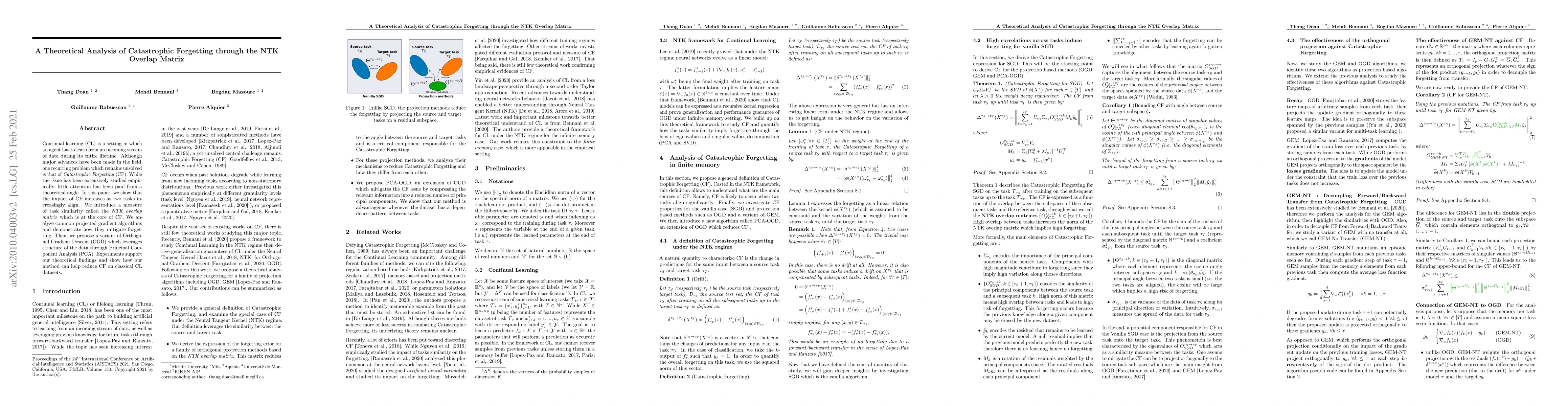 Continual learning (CL) is a setting in which an agent has to learn from an incoming stream of data during its entire lifetime. Although major advances have been made in the field, one recurring problem which remains unsolved is that of Catastrophic Forgetting (CF). While the issue has been extensively studied empirically, little attention has been paid from a theoretical angle. In this paper, we show that the impact of CF increases as two tasks increasingly align. We introduce a measure of task similarity called the NTK overlap matrix which is at the core of CF. We analyze common projected gradient algorithms and demonstrate how they mitigate forgetting. Then, we propose a variant of Orthogonal Gradient Descent (OGD) which leverages structure of the data through Principal Component Analysis (PCA). Experiments support our theoretical findings and show how our method can help reduce CF on classical CL datasets.