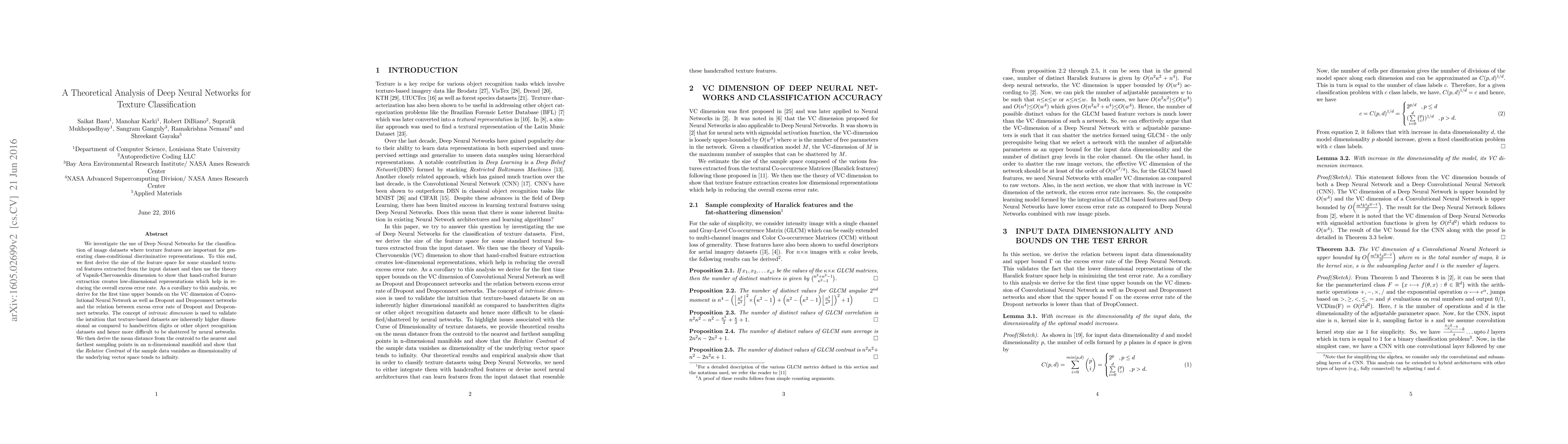We investigate the use of Deep Neural Networks for the classification of image datasets where texture features are important for generating class-conditional discriminative representations. To this end, we first derive the size of the feature space for some standard textural features extracted from the input dataset and then use the theory of Vapnik-Chervonenkis dimension to show that hand-crafted feature extraction creates low-dimensional representations which help in reducing the overall excess error rate. As a corollary to this analysis, we derive for the first time upper bounds on the VC dimension of Convolutional Neural Network as well as Dropout and Dropconnect networks and the relation between excess error rate of Dropout and Dropconnect networks. The concept of intrinsic dimension is used to validate the intuition that texture-based datasets are inherently higher dimensional as compared to handwritten digits or other object recognition datasets and hence more difficult to be shattered by neural networks. We then derive the mean distance from the centroid to the nearest and farthest sampling points in an n-dimensional manifold and show that the Relative Contrast of the sample data vanishes as dimensionality of the underlying vector space tends to infinity.