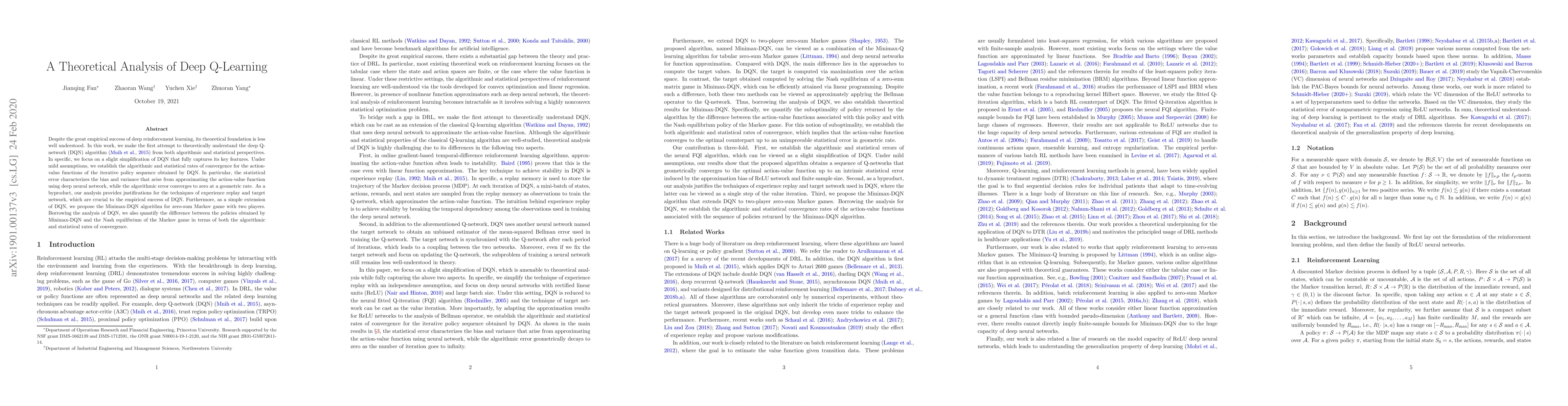 This paper theoretically analyzes the deep Q-network (DQN) algorithm, establishing its convergence rates and justifying techniques like experience replay and target networks. It also introduces Minimax-DQN for zero-sum games, providing convergence analysis for the resulting policies.