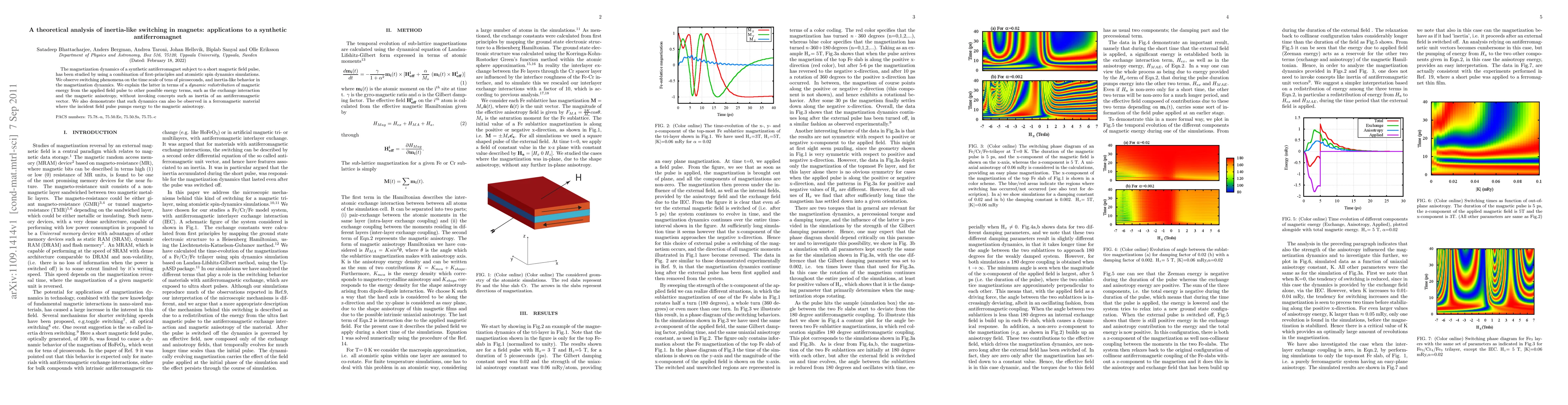 The magnetization dynamics of a synthetic antiferromagnet subject to a short magnetic field pulse, has been studied by using a combination of first-principles and atomistic spin dynamics simulations. We observe switching phenomena on the time scale of tens of picoseconds, and inertia-like behavior in the magnetization dynamics. We explain the latter in terms of a dynamic redistribution of magnetic energy from the applied field pulse to other possible energy terms, such as the exchange interaction and the magnetic anisotropy, without invoking concepts such as inertia of an antiferromagnetic vector. We also demonstrate that such dynamics can also be observed in a ferromagnetic material where the incident field pulse pumps energy to the magnetic anisotropy.