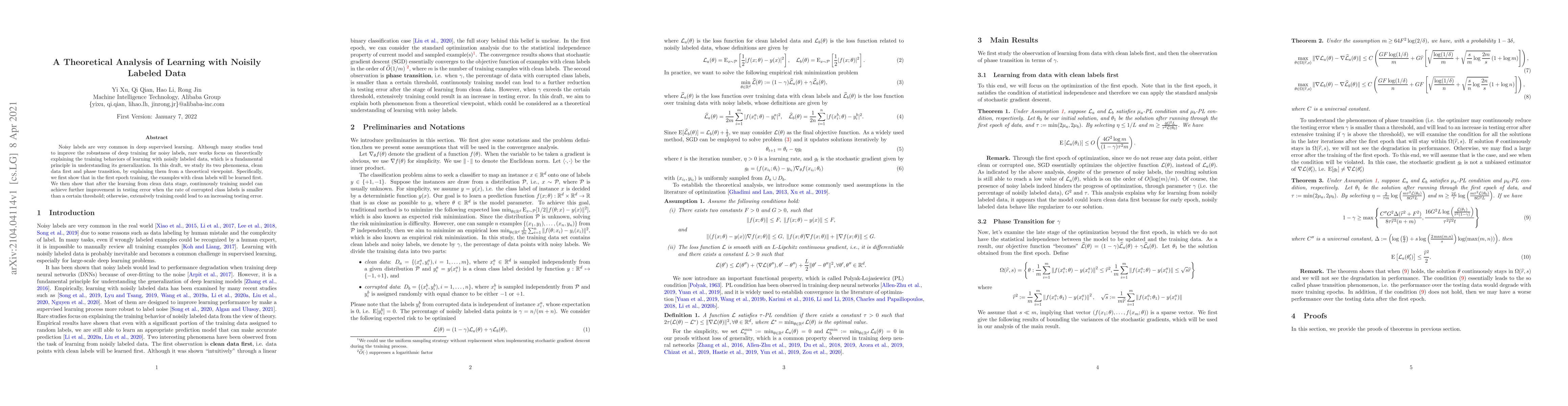 The paper provides a theoretical analysis of learning with noisily labeled data, focusing on two phenomena: learning from clean data first and phase transition, explained through optimization and non-convex optimization theories.