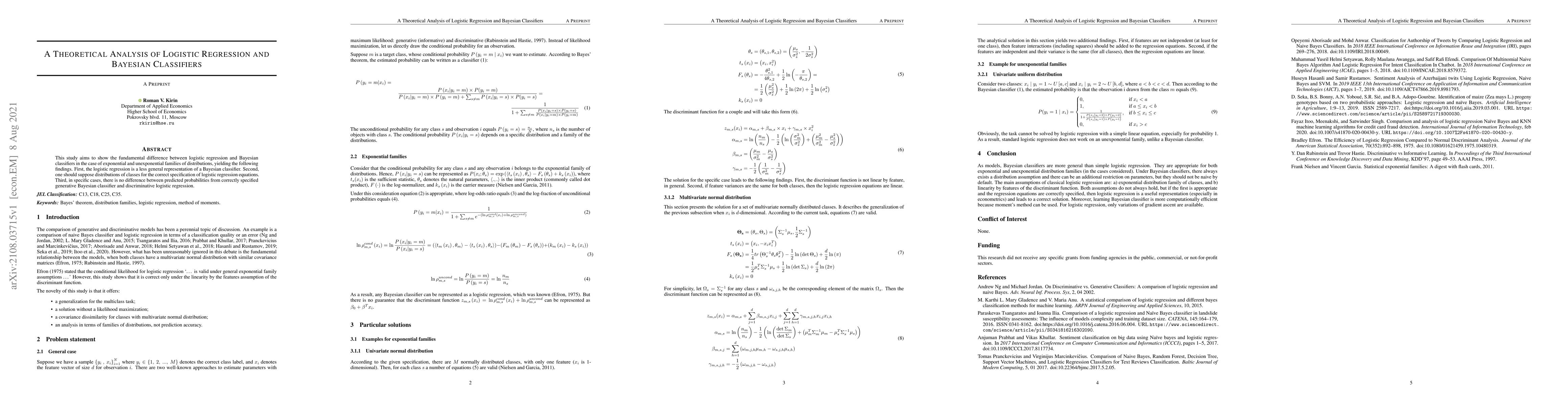 This paper contrasts logistic regression and Bayesian classifiers, finding that logistic regression is a less general form of the Bayesian classifier and that correct logistic regression specification requires class distribution assumptions. It concludes that in certain scenarios, the predicted probabilities from both methods can be identical.