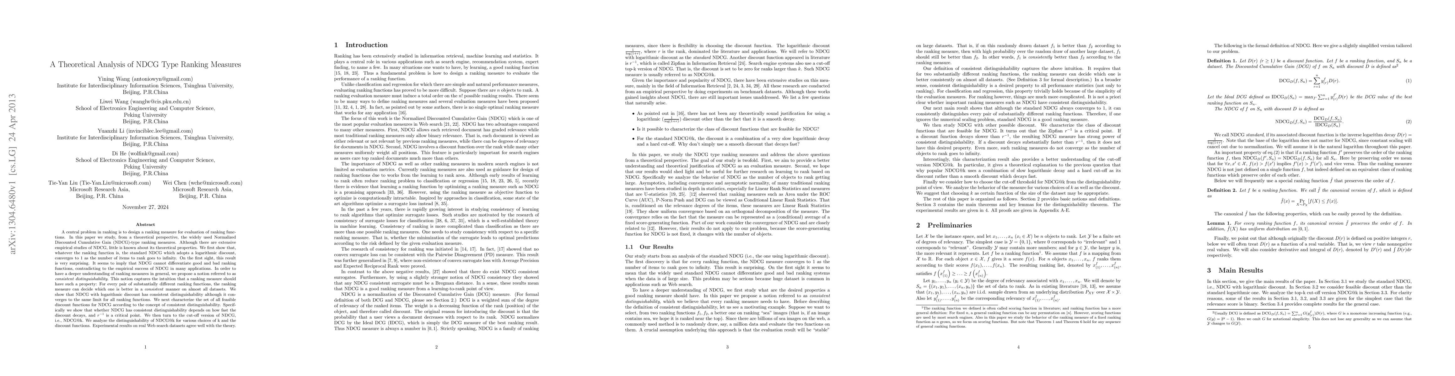 A central problem in ranking is to design a ranking measure for evaluation of ranking functions. In this paper we study, from a theoretical perspective, the widely used Normalized Discounted Cumulative Gain (NDCG)-type ranking measures. Although there are extensive empirical studies of NDCG, little is known about its theoretical properties. We first show that, whatever the ranking function is, the standard NDCG which adopts a logarithmic discount, converges to 1 as the number of items to rank goes to infinity. On the first sight, this result is very surprising. It seems to imply that NDCG cannot differentiate good and bad ranking functions, contradicting to the empirical success of NDCG in many applications. In order to have a deeper understanding of ranking measures in general, we propose a notion referred to as consistent distinguishability. This notion captures the intuition that a ranking measure should have such a property: For every pair of substantially different ranking functions, the ranking measure can decide which one is better in a consistent manner on almost all datasets. We show that NDCG with logarithmic discount has consistent distinguishability although it converges to the same limit for all ranking functions. We next characterize the set of all feasible discount functions for NDCG according to the concept of consistent distinguishability. Specifically we show that whether NDCG has consistent distinguishability depends on how fast the discount decays, and 1/r is a critical point. We then turn to the cut-off version of NDCG, i.e., NDCG@k. We analyze the distinguishability of NDCG@k for various choices of k and the discount functions. Experimental results on real Web search datasets agree well with the theory.