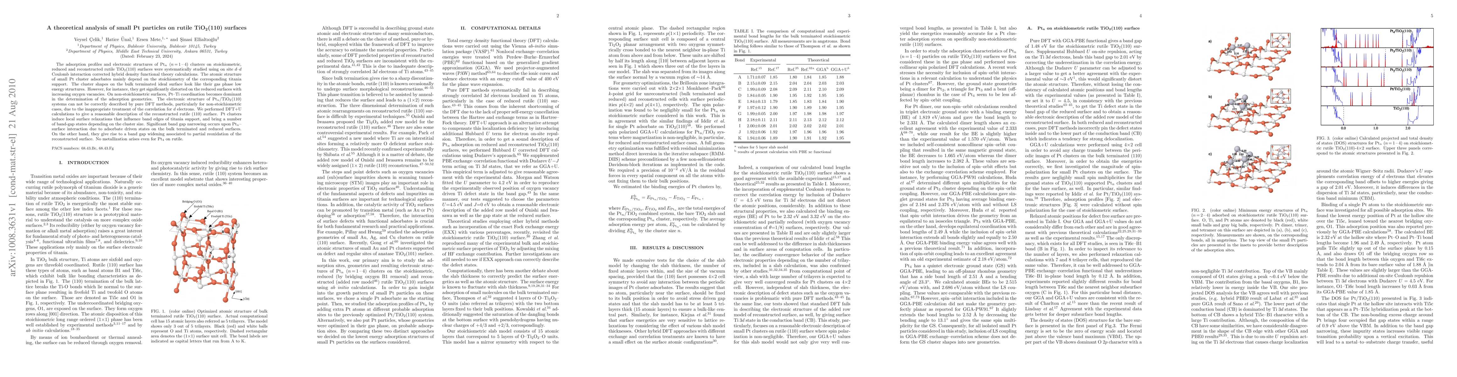 The adsorption profiles and electronic structures of Pt$_n$ (n = 1--4) clusters on stoichiometric, reduced and reconstructed rutile TiO$_2$(110) surfaces were systematically studied using on site d-d Coulomb interaction corrected hybrid density functional theory calculations. The atomic structure of small Pt cluster adsorbates mainly depend on the stoichiometry of the corresponding titania support. The cluster shapes on the bulk terminated ideal surface look like their gas phase low energy structures. However, for instance, they get significantly distorted on the reduced surfaces with increasing oxygen vacancies. On non-stoichiometric surfaces, Pt--Ti coordination becomes dominant in the determination of the adsorption geometries. The electronic structure of Pt$_n$/TiO$_2$(110) systems can not be correctly described by pure DFT methods, particularly for non-stoichiometric cases, due to the inappropriate treatment of the correlation for $d$ electrons. We performed DFT+U calculations to give a reasonable description of the reconstructed rutile (110) surface. Pt clusters induce local surface relaxations that influence band edges of titania support, and bring a number of band-gap states depending on the cluster size. Significant band gap narrowing occurs upon Pt$_n$--surface interaction due to adsorbate driven states on the bulk terminated and reduced surfaces. On the other hand, they give rise to a band gap widening associated to partial reoxidation of the reconstructed surface. No metallization arises even for Pt$_4$ on rutile.