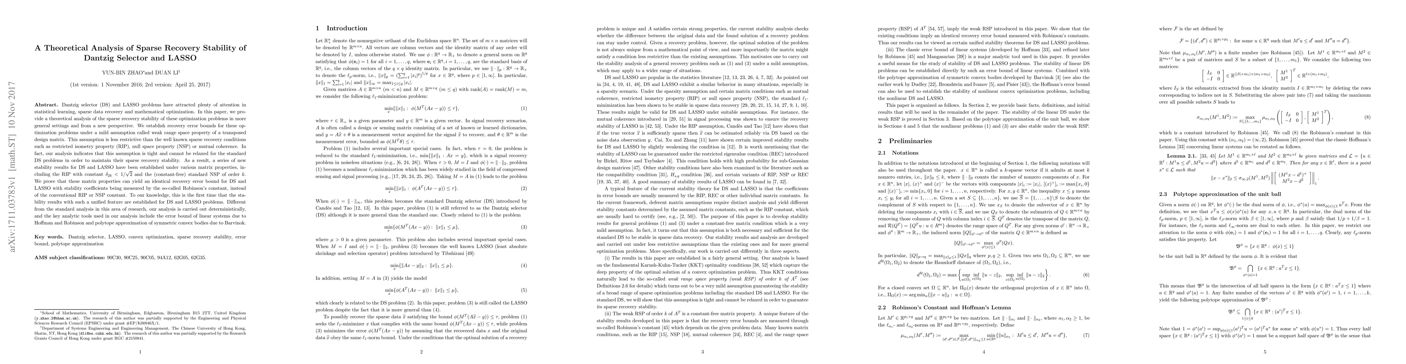 This paper provides a theoretical analysis of the sparse recovery stability of Dantzig Selector (DS) and LASSO problems under a new, less restrictive assumption compared to traditional conditions like RIP or NSP. It establishes recovery error bounds and introduces Robinson's constant for stability, offering a unified stability result for DS and LASSO for the first time.