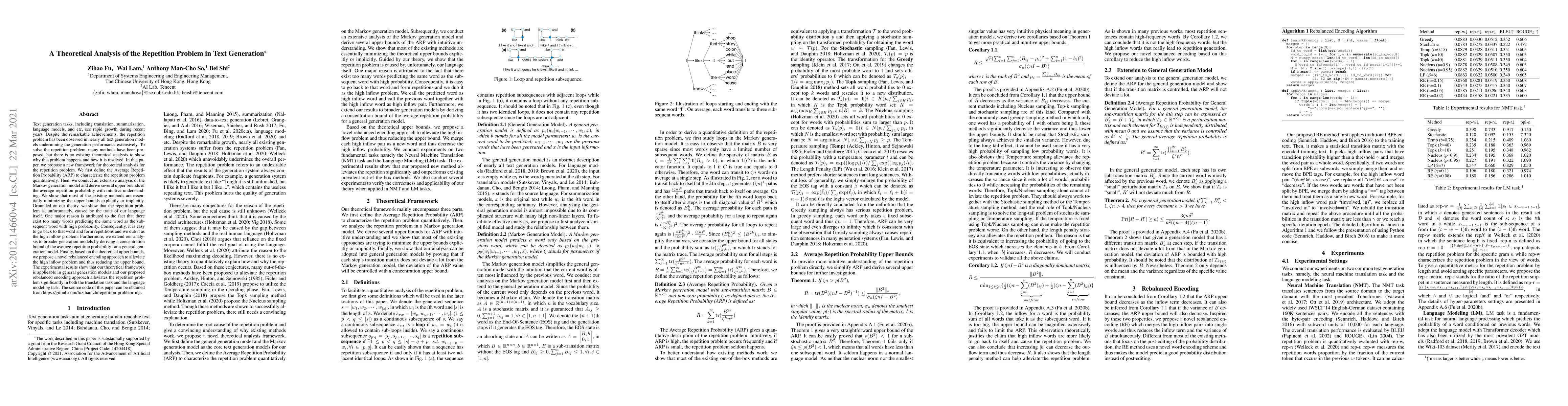 This paper proposes a theoretical framework to analyze the repetition problem in text generation, defining the Average Repetition Probability (ARP) to quantify it. It shows that the problem is rooted in the inherent structure of language, particularly the "high inflow problem," and introduces a rebalanced encoding approach to mitigate it, demonstrating its effectiveness experimentally.
