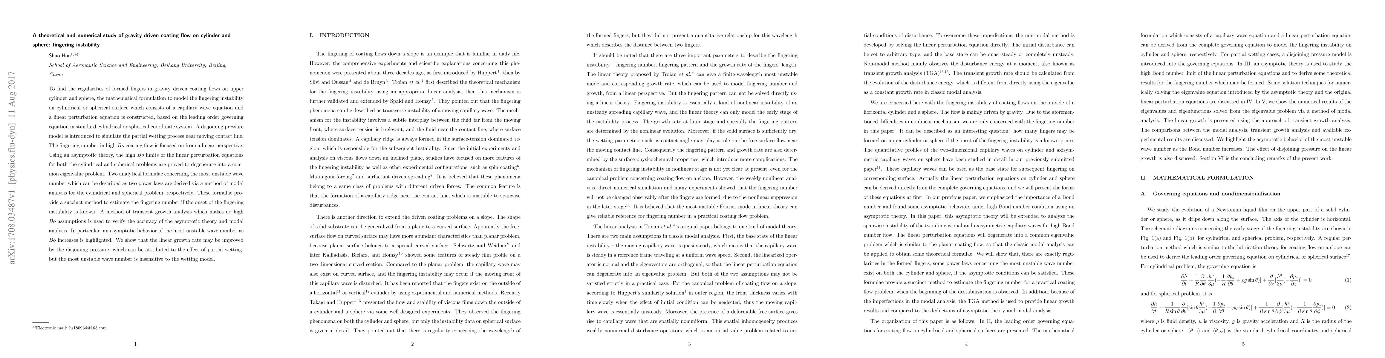 To find the regularities of formed fingers in gravity driven coating flows on upper cylinder and sphere, the mathematical formulation to model the fingering instability on cylindrical or spherical surface which consists of a capillary wave equation and a linear perturbation equation is constructed, based on the leading order governing equation in standard cylindrical or spherical coordinate system. A disjoining pressure model is introduced to simulate the partial wetting process near moving contact line. The fingering number in high $Bo$ coating flow is focused on from a linear perspective. Using an asymptotic theory, the high $Bo$ limits of the linear perturbation equations for both the cylindrical and spherical problems are proved to degenerate into a common eigenvalue problem. Two analytical formulae concerning the most unstable wave number which can be described as two power laws are derived via a method of modal analysis for the cylindrical and spherical problem, respectively. These formulae provide a succinct method to estimate the fingering number if the onset of the fingering instability is known. A method of transient growth analysis which makes no high $Bo$ assumptions is used to verify the accuracy of the asymptotic theory and modal analysis. In particular, an asymptotic behavior of the most unstable wave number as $Bo$ increases is highlighted. We show that the linear growth rate may be improved by the disjoining pressure, which can be attributed to the effect of partial wetting, but the most unstable wave number is insensitive to the wetting model.