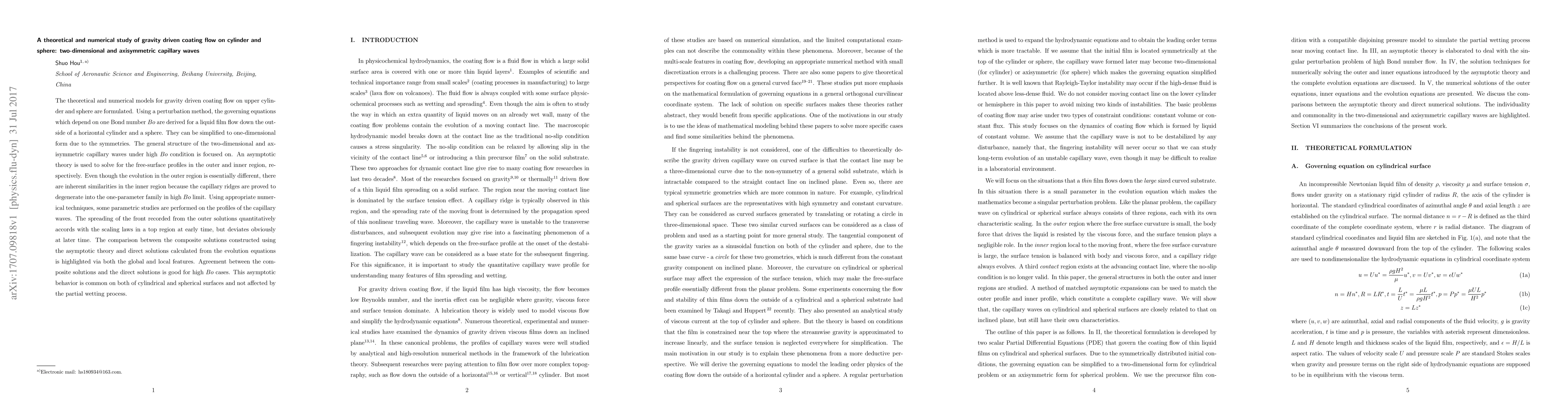 The theoretical and numerical models for gravity driven coating flow on upper cylinder and sphere are formulated. Using a perturbation method, the governing equations which depend on one Bond number $Bo$ are derived for a liquid film flow down the outside of a horizontal cylinder and a sphere. They can be simplified to one-dimensional form due to the symmetries. The general structure of the two-dimensional and axisymmetric capillary waves under high $Bo$ condition is focused on. An asymptotic theory is used to solve for the free-surface profiles in the outer and inner region, respectively. Even though the evolution in the outer region is essentially different, there are inherent similarities in the inner region because the capillary ridges are proved to degenerate into the one-parameter family in high $Bo$ limit. Using appropriate numerical techniques, some parametric studies are performed on the profiles of the capillary waves. The spreading of the front recorded from the outer solutions quantitatively accords with the scaling laws in a top region at early time, but deviates obviously at later time. The comparison between the composite solutions constructed using the asymptotic theory and direct solutions calculated from the evolution equations is highlighted via both the global and local features. Agreement between the composite solutions and the direct solutions is good for high $Bo$ cases. This asymptotic behavior is common on both of cylindrical and spherical surfaces and not affected by the partial wetting process.