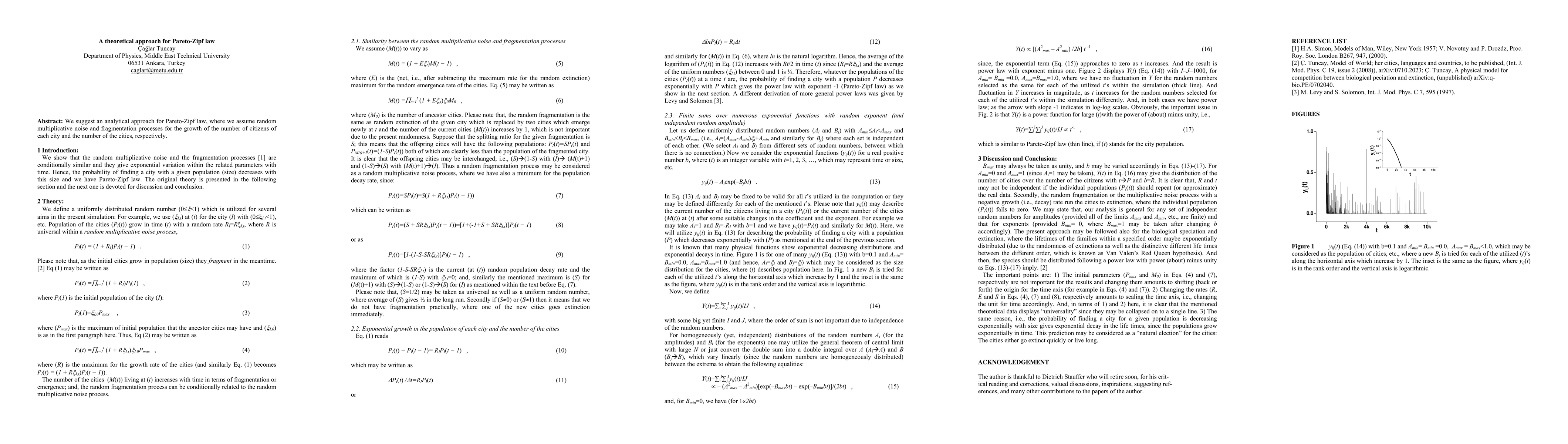 Summary: This paper proposes an analytical framework for the Pareto-Zipf law, utilizing random multiplicative noise and fragmentation processes to model the growth of city populations and the emergence of new cities. The approach aims to explain the distribution patterns observed in urban systems.