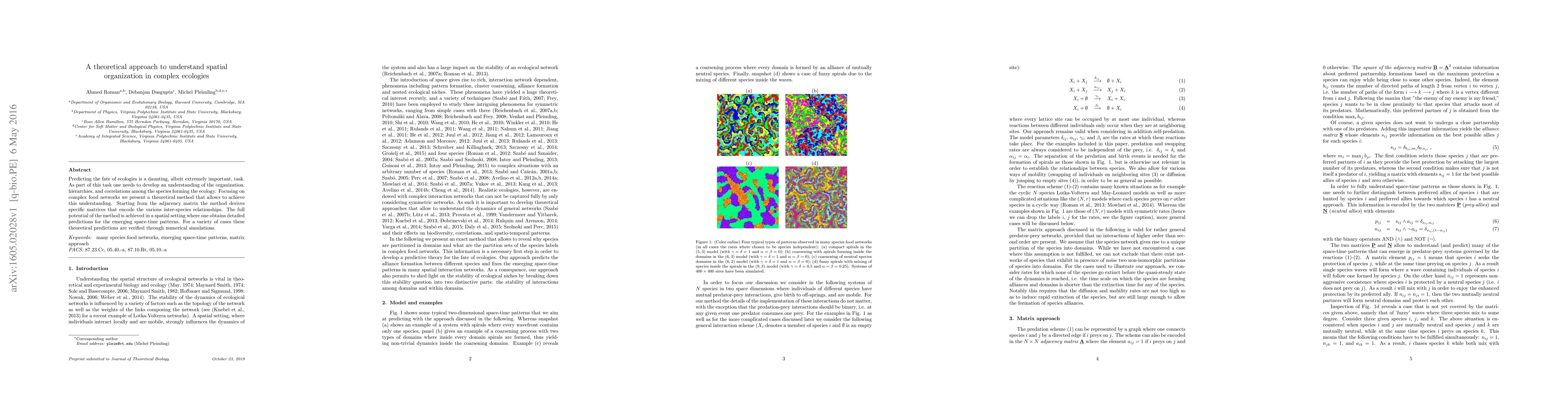 This paper introduces a theoretical method to understand the organization and relationships among species in complex food networks, using adjacency matrices. The approach is particularly effective in spatial settings, with numerical simulations confirming its predictive accuracy for emerging space-time patterns.