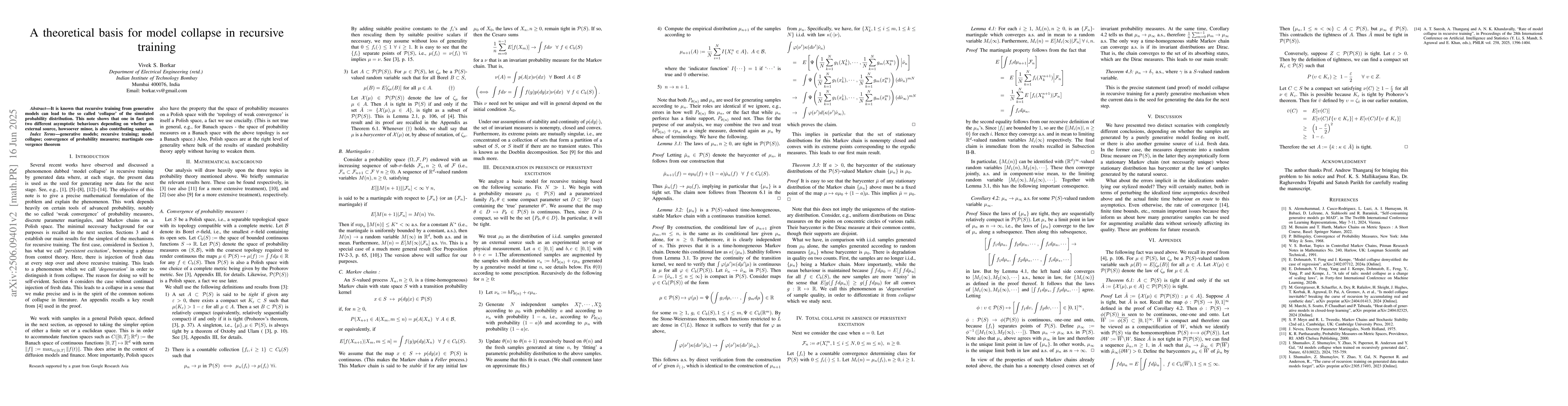 It is known that recursive training from generative models can lead to the so called `collapse' of the simulated probability distribution. This note shows that one in fact gets two different asymptotic behaviours depending on whether an external source, howsoever minor, is also contributing samples.