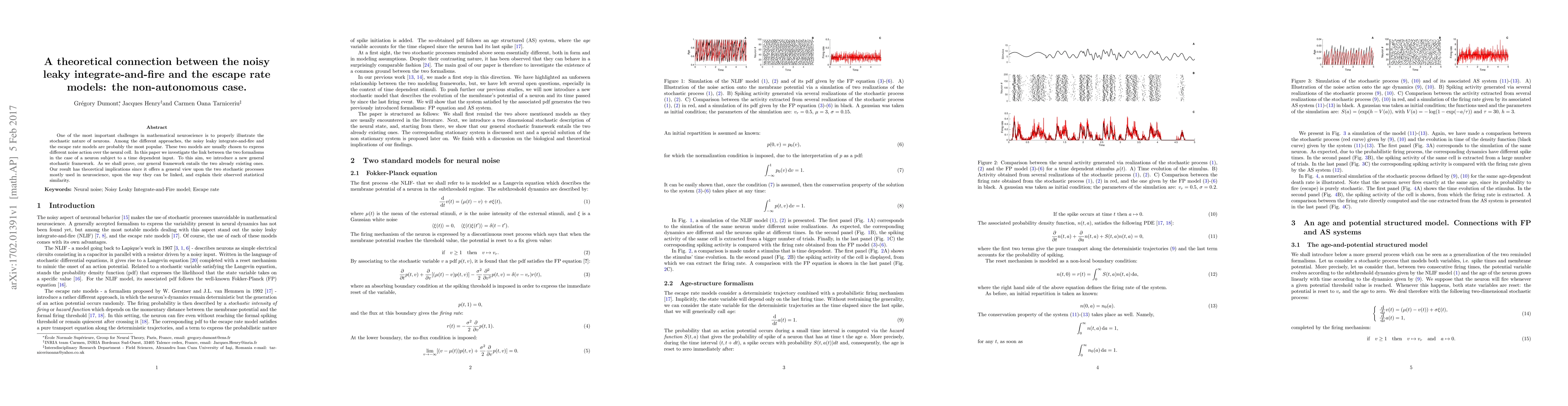 This paper establishes a theoretical connection between the noisy leaky integrate-and-fire and escape rate models for neurons under time-dependent input, introducing a new general stochastic framework that encompasses both existing models and explains their statistical similarity.