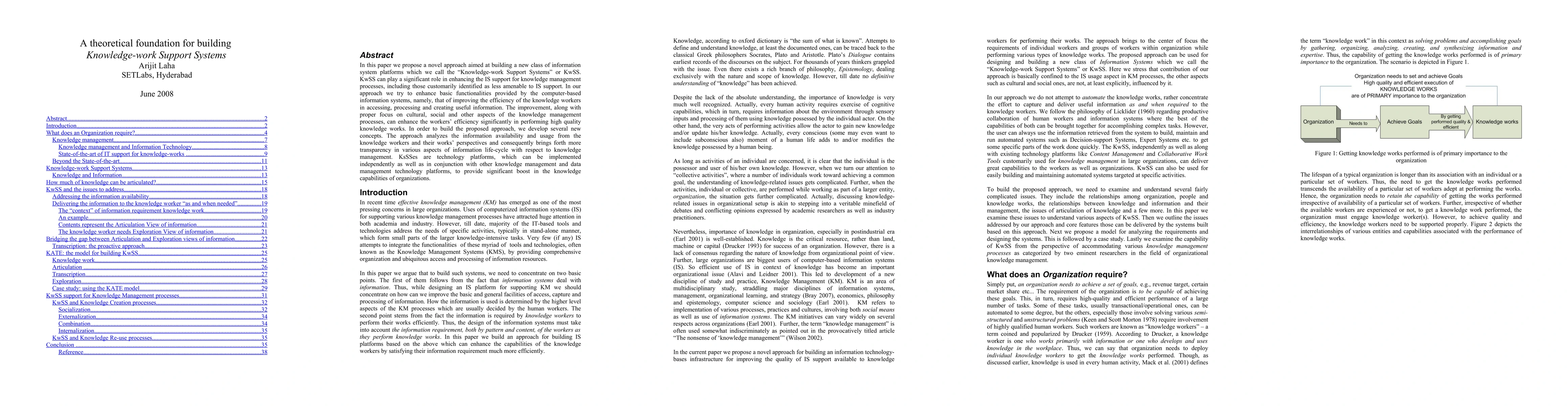 This paper introduces a new class of information systems called Knowledge-work Support Systems (KwSS) designed to enhance IS support for knowledge management, particularly for traditionally less amenable processes. The proposed approach aims to improve the efficiency of knowledge workers in accessing, processing, and creating information, while incorporating cultural and social aspects to boost overall performance.