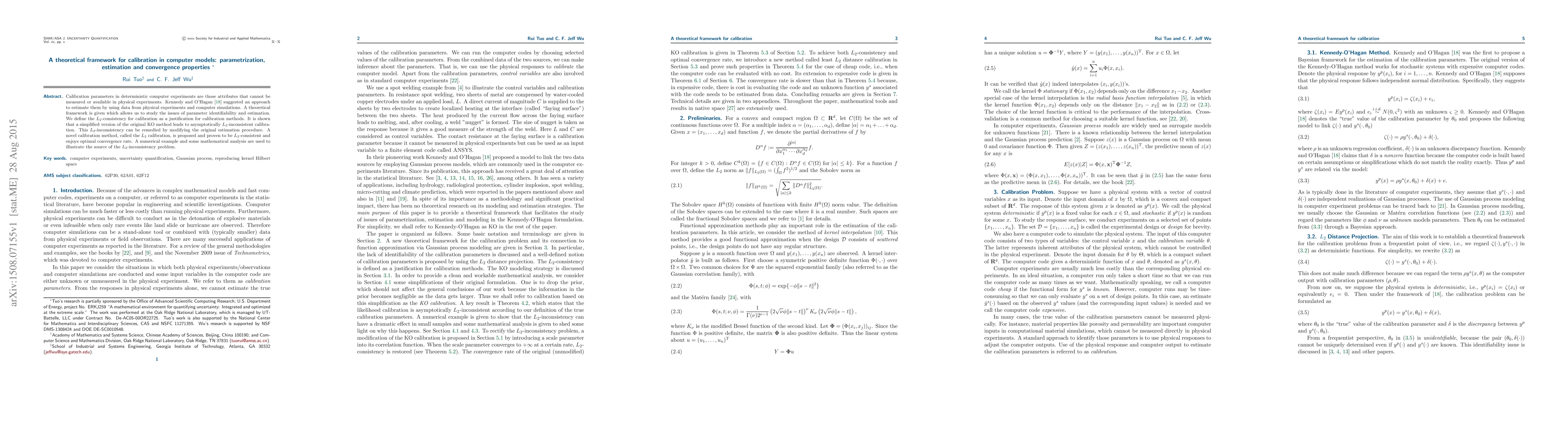 Calibration parameters in deterministic computer experiments are those attributes that cannot be measured or available in physical experiments. Kennedy and O'Hagan \cite{kennedy2001bayesian} suggested an approach to estimate them by using data from physical experiments and computer simulations. A theoretical framework is given which allows us to study the issues of parameter identifiability and estimation. We define the $L_2$-consistency for calibration as a justification for calibration methods. It is shown that a simplified version of the original KO method leads to asymptotically $L_2$-inconsistent calibration. This $L_2$-inconsistency can be remedied by modifying the original estimation procedure. A novel calibration method, called the $L_2$ calibration, is proposed and proven to be $L_2$-consistent and enjoys optimal convergence rate. A numerical example and some mathematical analysis are used to illustrate the source of the $L_2$-inconsistency problem.