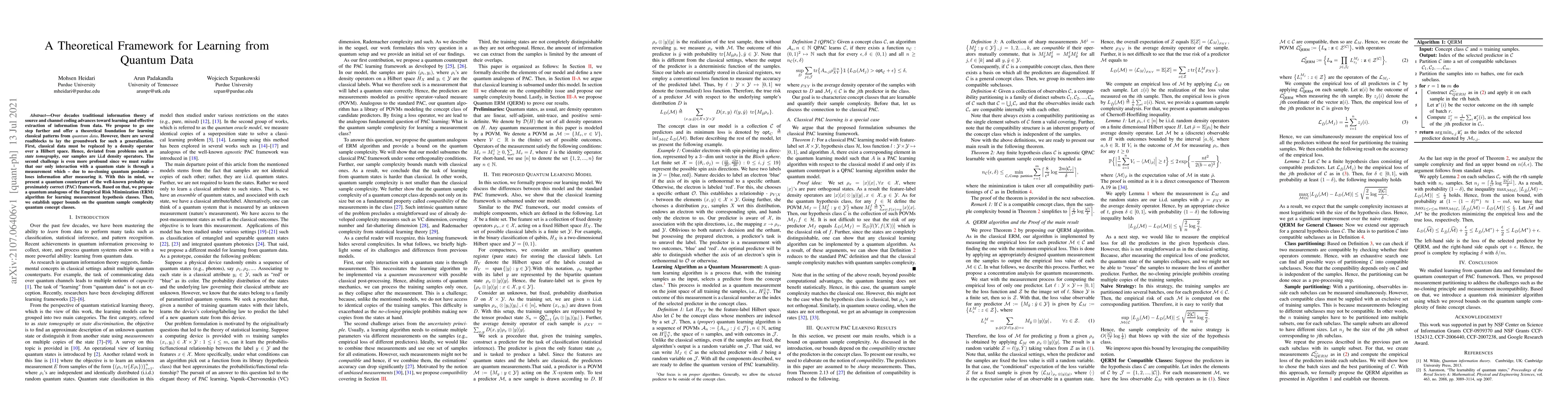 Over decades traditional information theory of source and channel coding advances toward learning and effective extraction of information from data. We propose to go one step further and offer a theoretical foundation for learning classical patterns from quantum data. However, there are several roadblocks to lay the groundwork for such a generalization. First, classical data must be replaced by a density operator over a Hilbert space. Hence, deviated from problems such as state tomography, our samples are i.i.d density operators. The second challenge is even more profound since we must realize that our only interaction with a quantum state is through a measurement which -- due to no-cloning quantum postulate -- loses information after measuring it. With this in mind, we present a quantum counterpart of the well-known PAC framework. Based on that, we propose a quantum analogous of the ERM algorithm for learning measurement hypothesis classes. Then, we establish upper bounds on the quantum sample complexity quantum concept classes.