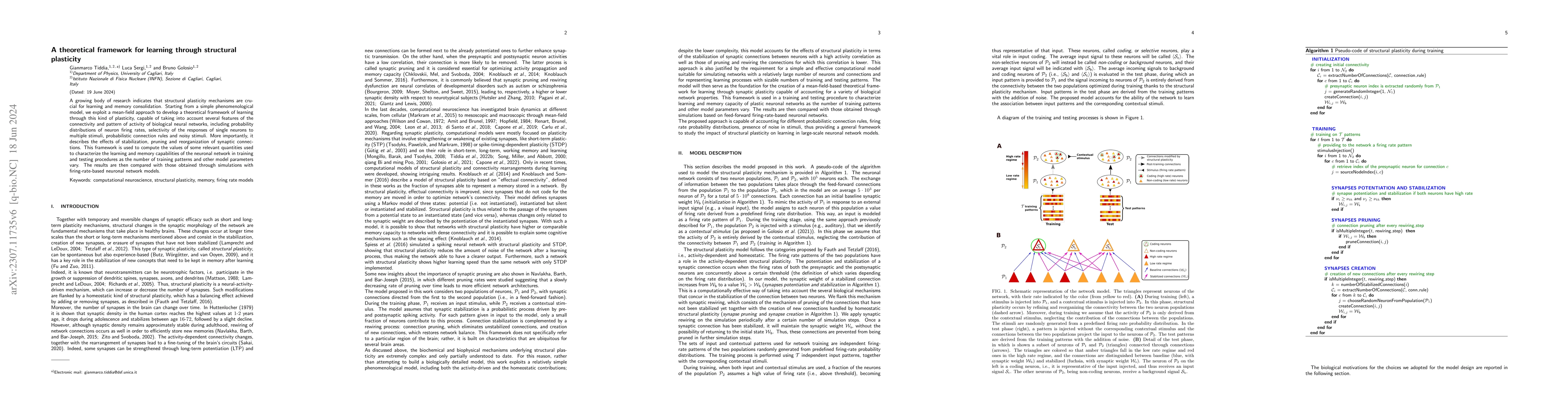 This paper develops a theoretical framework for learning via structural plasticity, using a mean-field approach to model biological neural networks' connectivity and activity patterns, including synaptic stabilization, pruning, and reorganization. The framework computes learning and memory metrics, comparing theoretical results with firing-rate-based neuronal network simulations.