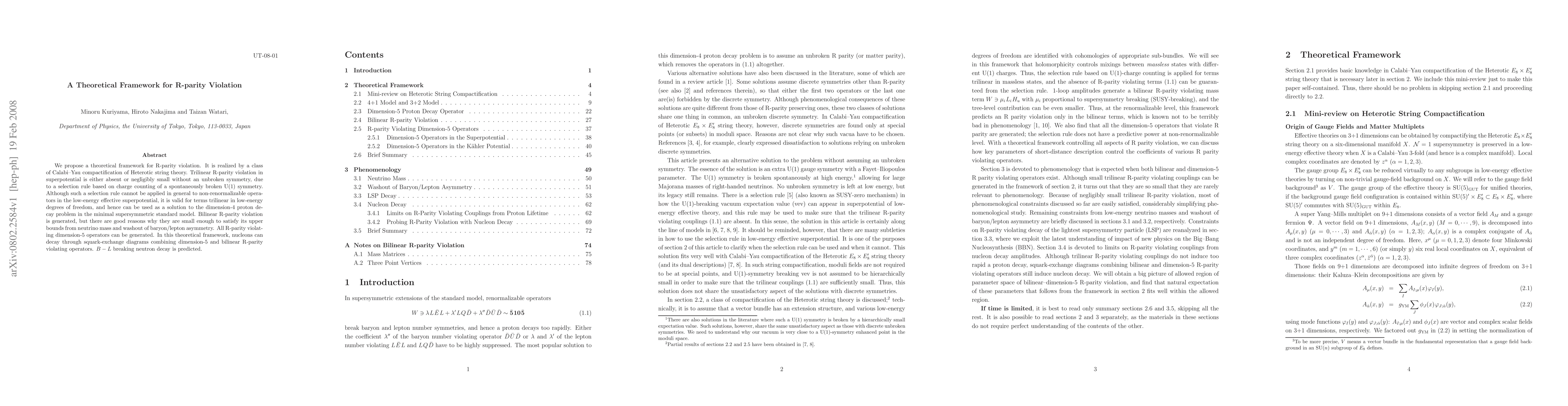 We propose a theoretical framework for R-parity violation. It is realized by a class of Calabi--Yau compactification of Heterotic string theory. Trilinear R-parity violation in superpotential is either absent or negligibly small without an unbroken symmetry, due to a selection rule based on charge counting of a spontaneously broken U(1) symmetry. Although such a selection rule cannot be applied in general to non-renormalizable operators in the low-energy effective superpotential, it is valid for terms trilinear in low-energy degrees of freedom, and hence can be used as a solution to the dimension-4 proton decay problem in the minimal supersymmetric standard model. Bilinear R-parity violation is generated, but there are good reasons why they are small enough to satisfy its upper bounds from neutrino mass and washout of baryon/lepton asymmetry. All R-parity violating dimension-5 operators can be generated. In this theoretical framework, nucleons can decay through squark-exchange diagrams combining dimension-5 and bilinear R-parity violating operators. B-L breaking neutron decay is predicted.