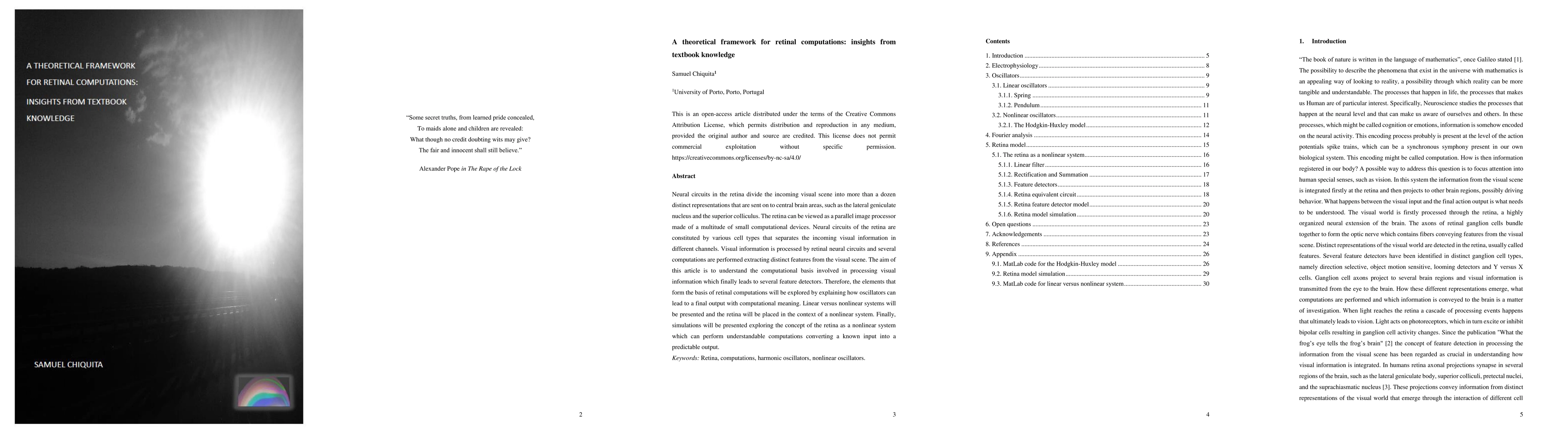 Neural circuits in the retina divide the incoming visual scene into more than a dozen distinct representations that are sent on to central brain areas, such as the lateral geniculate nucleus and the superior colliculus. The retina can be viewed as a parallel image processor made of a multitude of small computational devices. Neural circuits of the retina are constituted by various cell types that separate the incoming visual information in different channels. Visual information is processed by retinal neural circuits and several computations are performed extracting distinct features from the visual scene. The aim of this article is to understand the computational basis involved in processing visual information which finally leads to several feature detectors. Therefore, the elements that form the basis of retinal computations will be explored by explaining how oscillators can lead to a final output with computational meaning. Linear versus nonlinear systems will be presented and the retina will be placed in the context of a nonlinear system. Finally, simulations will be presented exploring the concept of the retina as a nonlinear system which can perform understandable computations converting a known input into a predictable output.