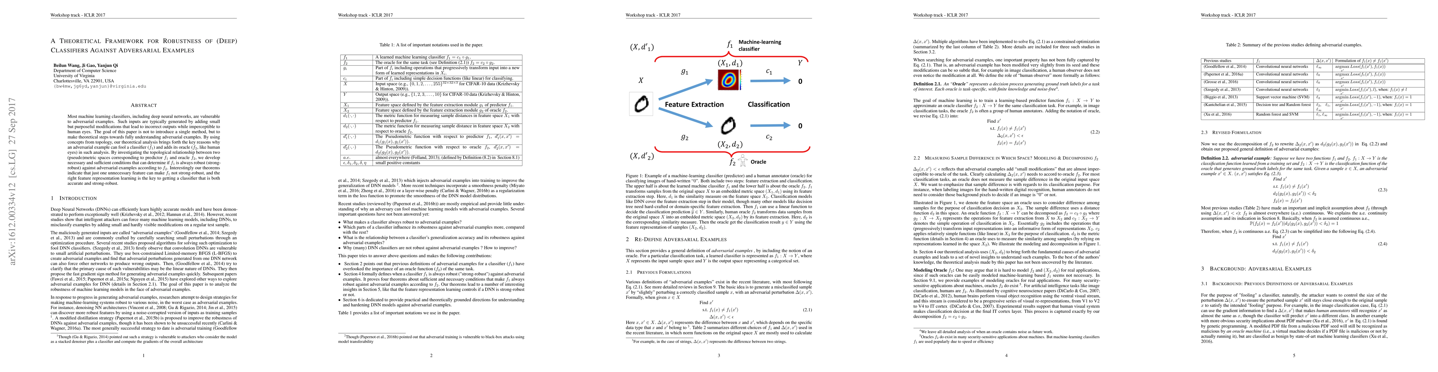 Most machine learning classifiers, including deep neural networks, are vulnerable to adversarial examples. Such inputs are typically generated by adding small but purposeful modifications that lead to incorrect outputs while imperceptible to human eyes. The goal of this paper is not to introduce a single method, but to make theoretical steps towards fully understanding adversarial examples. By using concepts from topology, our theoretical analysis brings forth the key reasons why an adversarial example can fool a classifier ($f_1$) and adds its oracle ($f_2$, like human eyes) in such analysis. By investigating the topological relationship between two (pseudo)metric spaces corresponding to predictor $f_1$ and oracle $f_2$, we develop necessary and sufficient conditions that can determine if $f_1$ is always robust (strong-robust) against adversarial examples according to $f_2$. Interestingly our theorems indicate that just one unnecessary feature can make $f_1$ not strong-robust, and the right feature representation learning is the key to getting a classifier that is both accurate and strong-robust.