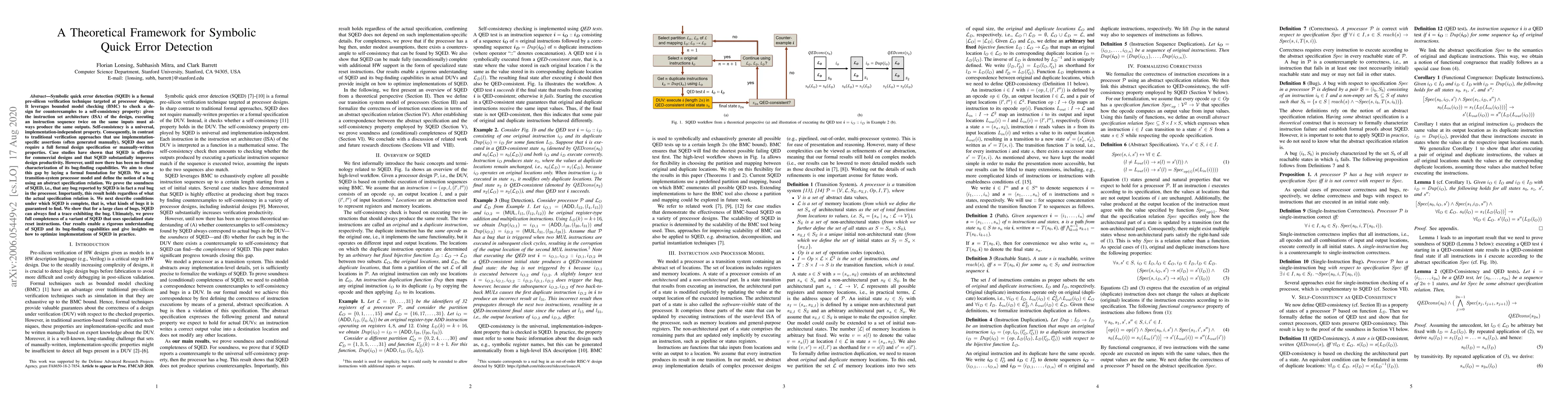 This paper establishes a theoretical framework for symbolic quick error detection (SQED), a pre-silicon verification technique for processor designs. It proves the soundness and completeness of SQED, showing that it can reliably detect bugs without requiring a full formal design specification, thus enhancing design productivity.