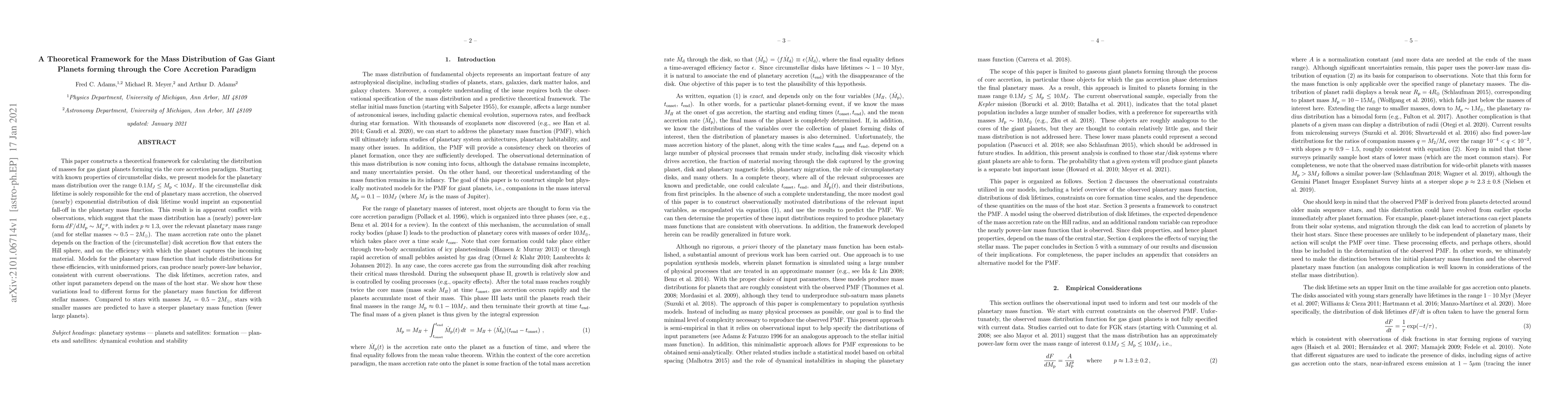 This paper constructs a theoretical framework for calculating the distribution of masses for gas giant planets forming via the core accretion paradigm. Starting with known properties of circumstellar disks, we present models for the planetary mass distribution over the range $0.1M_J < M_{\rm p} < 10M_J$. If the circumstellar disk lifetime is solely responsible for the end of planetary mass accretion, the observed (nearly) exponential distribution of disk lifetime would imprint an exponential fall-off in the planetary mass function. This result is in apparent conflict with observations, which suggest that the mass distribution has a (nearly) power-law form $dF/dM_{\rm p}\sim M_{\rm p}^{-p}$, with index $p\approx1.3$, over the relevant planetary mass range (and for stellar masses $\sim0.5-2M_\odot$). The mass accretion rate onto the planet depends on the fraction of the (circumstellar) disk accretion flow that enters the Hill sphere, and on the efficiency with which the planet captures the incoming material. Models for the planetary mass function that include distributions for these efficiencies, with uninformed priors, can produce nearly power-law behavior, consistent with current observations. The disk lifetimes, accretion rates, and other input parameters depend on the mass of the host star. We show how these variations lead to different forms for the planetary mass function for different stellar masses. Compared to stars with masses $M_\ast$ = $0.5-2M_\odot$, stars with smaller masses are predicted to have a steeper planetary mass function (fewer large planets).