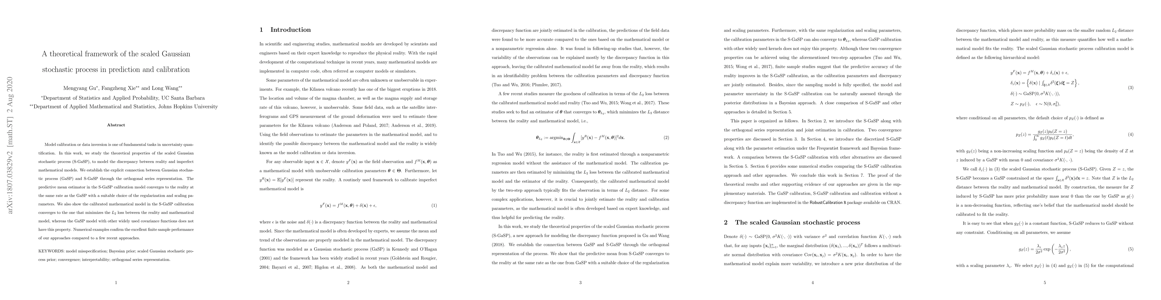 Model calibration or data inversion is one of fundamental tasks in uncertainty quantification. In this work, we study the theoretical properties of the scaled Gaussian stochastic process (S-GaSP), to model the discrepancy between reality and imperfect mathematical models. We establish the explicit connection between Gaussian stochastic process (GaSP) and S-GaSP through the orthogonal series representation. The predictive mean estimator in the S-GaSP calibration model converges to the reality at the same rate as the GaSP with a suitable choice of the regularization and scaling parameters. We also show the calibrated mathematical model in the S-GaSP calibration converges to the one that minimizes the $L_2$ loss between the reality and mathematical model, whereas the GaSP model with other widely used covariance functions does not have this property. Numerical examples confirm the excellent finite sample performance of our approaches compared to a few recent approaches.