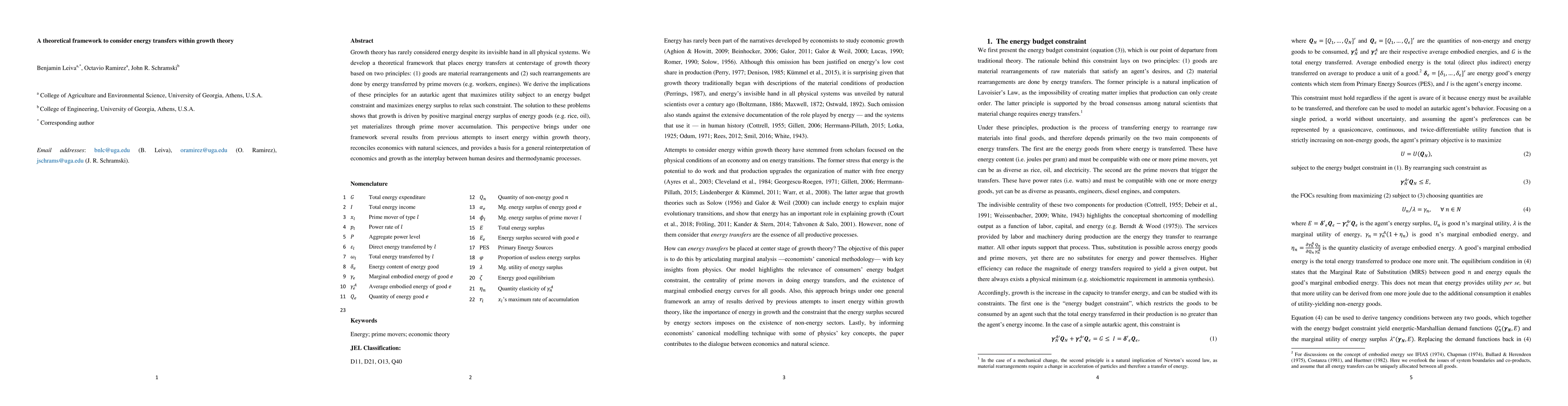 Growth theory has rarely considered energy despite its invisible hand in all physical systems. We develop a theoretical framework that places energy transfers at centerstage of growth theory based on two principles: (1) goods are material rearrangements and (2) such rearrangements are done by energy transferred by prime movers (e.g. workers, engines). We derive the implications of these principles for an autarkic agent that maximizes utility subject to an energy budget constraint and maximizes energy surplus to relax such constraint. The solution to these problems shows that growth is driven by positive marginal energy surplus of energy goods (e.g. rice, oil), yet materializes through prime mover accumulation. This perspective brings under one framework several results from previous attempts to insert energy within growth theory, reconciles economics with natural sciences, and provides a basis for a general reinterpretation of economics and growth as the interplay between human desires and thermodynamic processes.