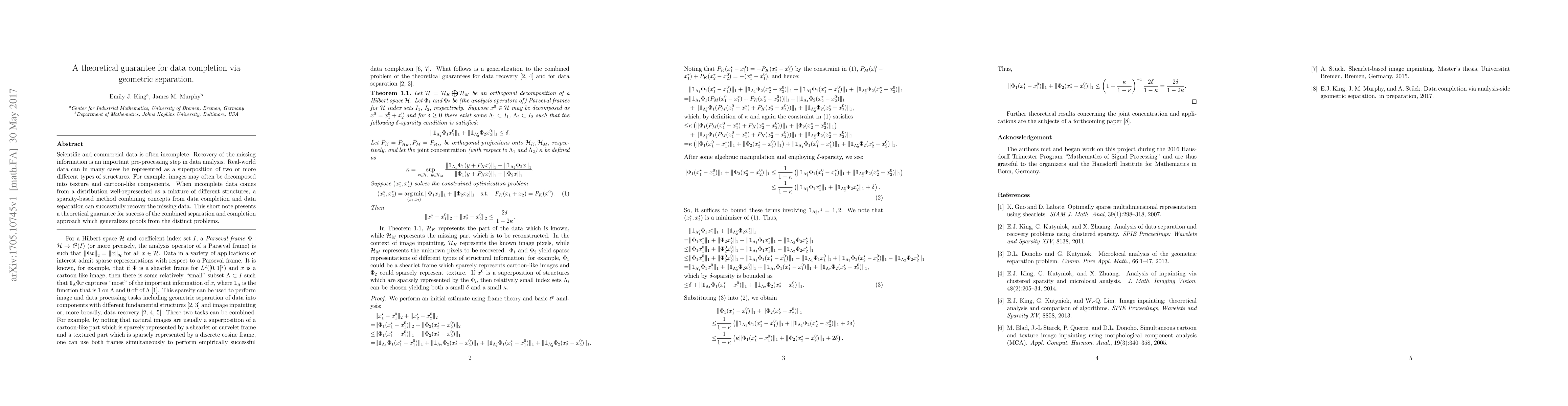 Scientific and commercial data is often incomplete. Recovery of the missing information is an important pre-processing step in data analysis. Real-world data can in many cases be represented as a superposition of two or more different types of structures. For example, images may often be decomposed into texture and cartoon-like components. When incomplete data comes from a distribution well-represented as a mixture of different structures, a sparsity-based method combining concepts from data completion and data separation can successfully recover the missing data. This short note presents a theoretical guarantee for success of the combined separation and completion approach which generalizes proofs from the distinct problems.