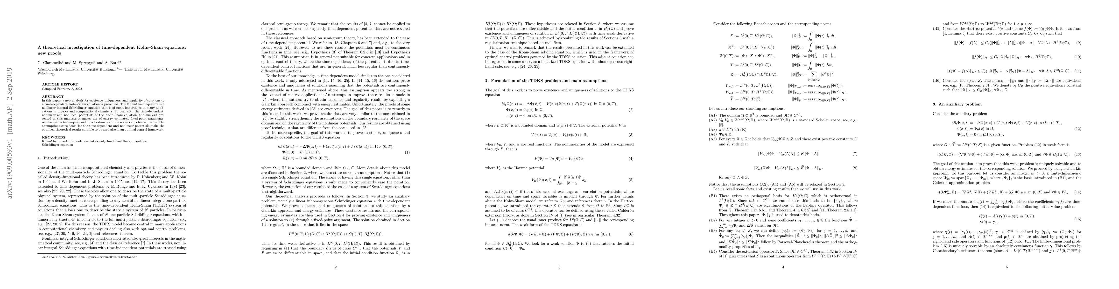 In this paper, a new analysis for existence, uniqueness, and regularity of solutions to a time-dependent Kohn-Sham equation is presented. The Kohn-Sham equation is a nonlinear integral Schroedinger equation that is of great importance in many applications in physics and computational chemistry. To deal with the time-dependent, nonlinear and non-local potentials of the Kohn-Sham equation, the analysis presented in this manuscript makes use of energy estimates, fixed-point arguments, regularization techniques, and direct estimates of the non-local potential terms. The assumptions considered for the time-dependent and nonlinear potentials make the obtained theoretical results suitable to be used also in an optimal control framework.