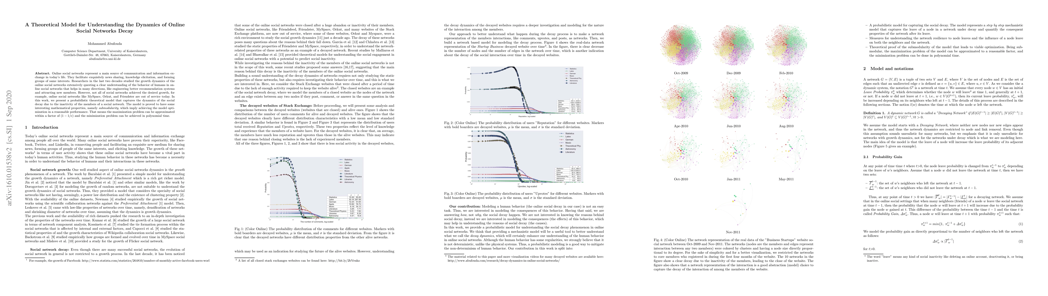 This paper proposes a probabilistic theoretical model to understand the decay dynamics of online social networks due to member inactivity, highlighting submodularity properties that enable efficient optimization and approximation techniques. The model aims to explain the decline of once-popular networks like MySpace, Orkut, and Friendster.