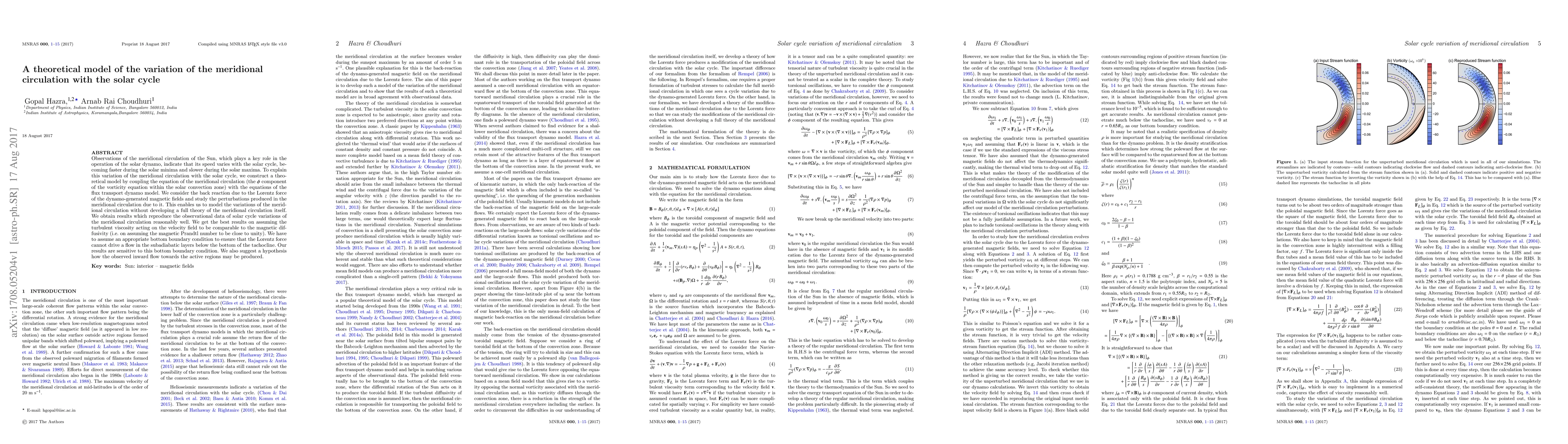 This paper constructs a theoretical model to explain the variation of the Sun's meridional circulation with the solar cycle, coupling the meridional circulation equation with the flux transport dynamo model. The model reasonably reproduces observational data, suggesting that the magnetic Prandtl number being close to unity provides the best fit.