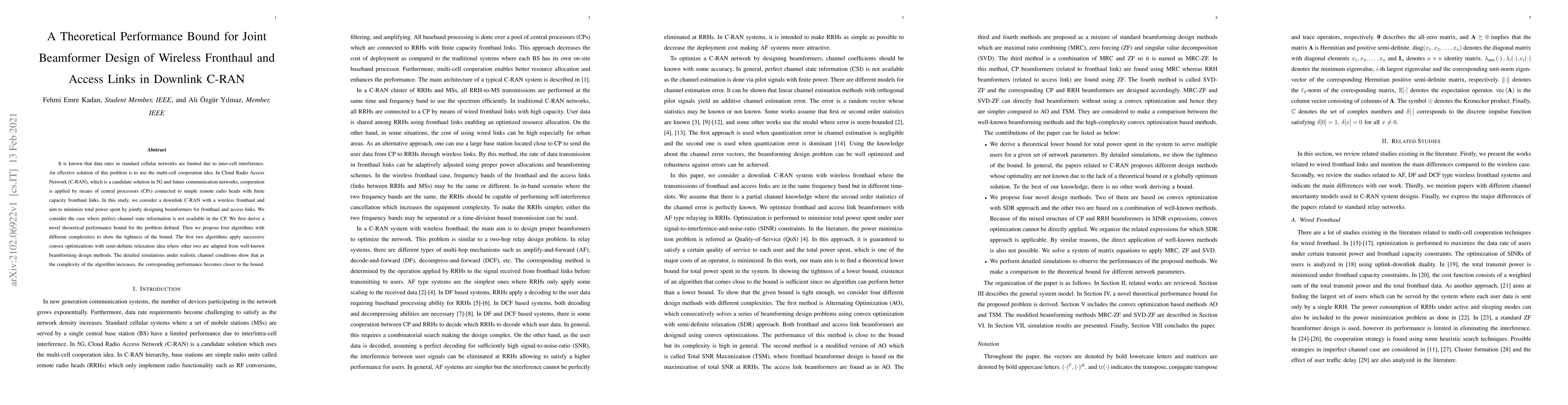 It is known that data rates in standard cellular networks are limited due to inter-cell interference. An effective solution of this problem is to use the multi-cell cooperation idea. In Cloud Radio Access Network (C-RAN), which is a candidate solution in 5G and future communication networks, cooperation is applied by means of central processors (CPs) connected to simple remote radio heads with finite capacity fronthaul links. In this study, we consider a downlink C-RAN with a wireless fronthaul and aim to minimize total power spent by jointly designing beamformers for fronthaul and access links. We consider the case where perfect channel state information is not available in the CP. We first derive a novel theoretical performance bound for the problem defined. Then we propose four algorithms with different complexities to show the tightness of the bound. The first two algorithms apply successive convex optimizations with semi-definite relaxation idea where other two are adapted from well-known beamforming design methods. The detailed simulations under realistic channel conditions show that as the complexity of the algorithm increases, the corresponding performance becomes closer to the bound.