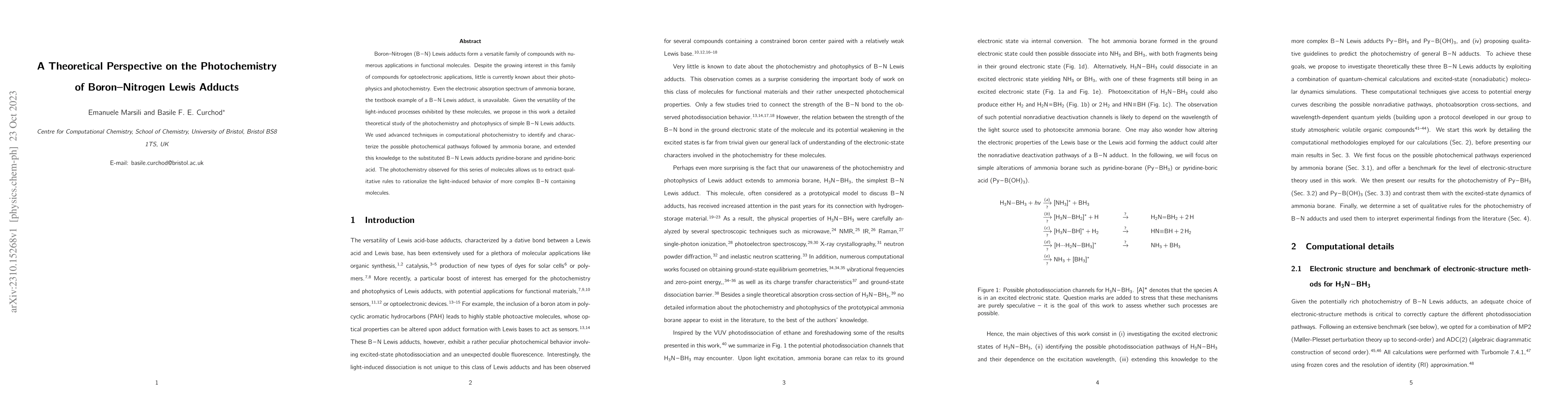 This paper presents a theoretical study using advanced computational methods to explore the photochemistry and photophysics of boron-nitrogen (B-N) Lewis adducts, focusing on ammonia borane, pyridine-borane, and pyridine-boric acid. The study identifies possible photochemical pathways and extracts qualitative rules to rationalize the light-induced behavior of these compounds for optoelectronic applications.
