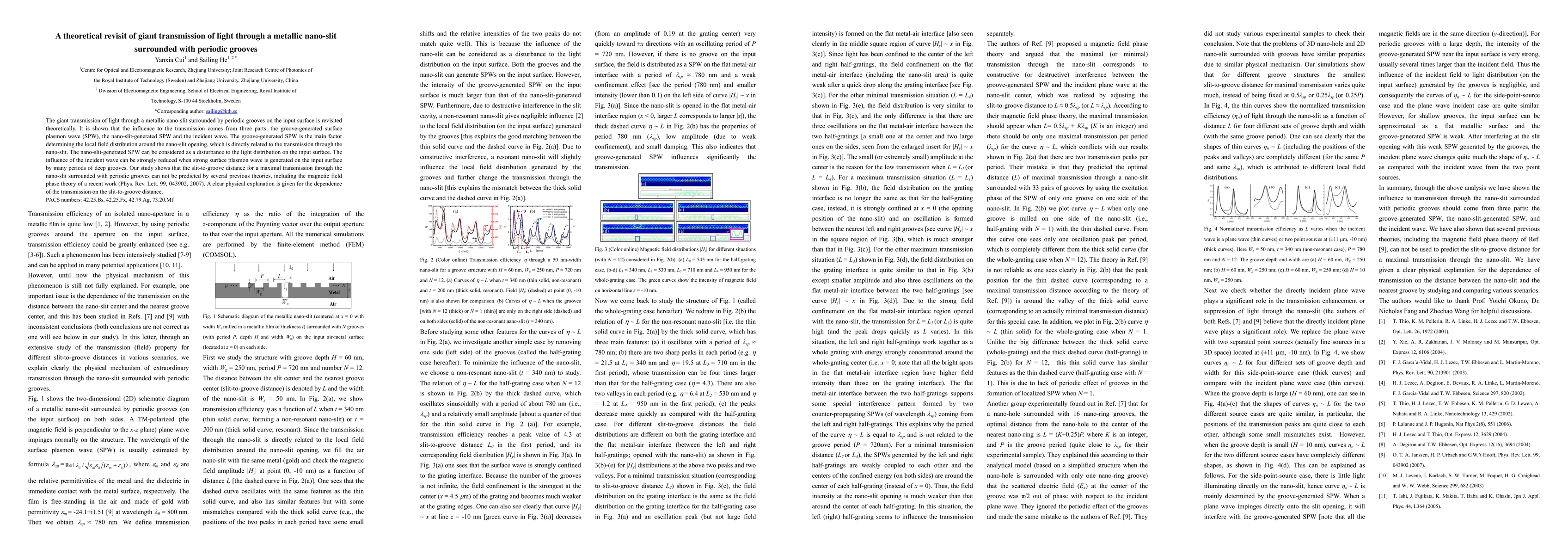 This paper revisits the theoretical mechanisms behind the giant transmission of light through a metallic nano-slit surrounded by periodic grooves. It identifies the groove-generated surface plasmon wave as the primary factor influencing the local field distribution and transmission, while the incident wave's influence can be minimized under strong surface plasmon wave conditions.