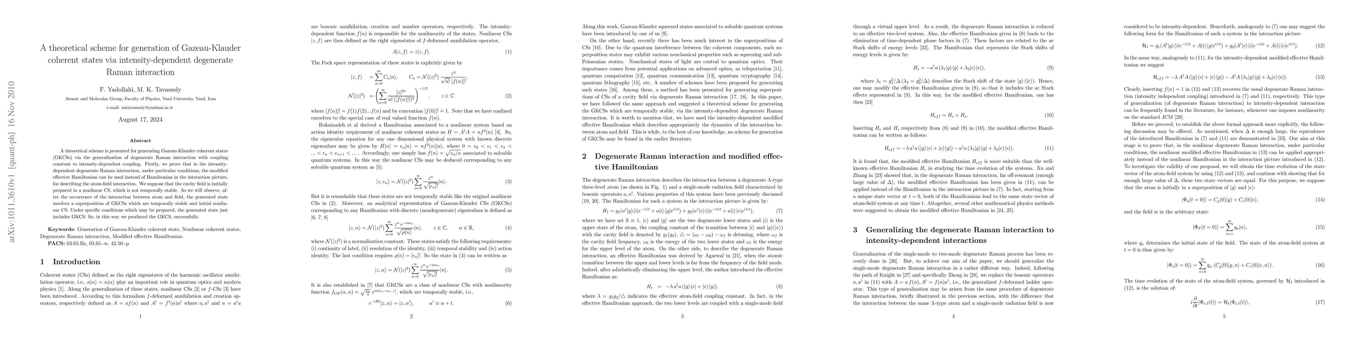 This paper proposes a theoretical scheme for generating Gazeau-Klauder coherent states (GKCSs) through an intensity-dependent degenerate Raman interaction. It demonstrates that under specific conditions, the modified effective Hamiltonian can describe the atom-field interaction, leading to a superposition of GKCSs and initial nonlinear coherent states, with potential for producing pure GKCSs under certain preparations.