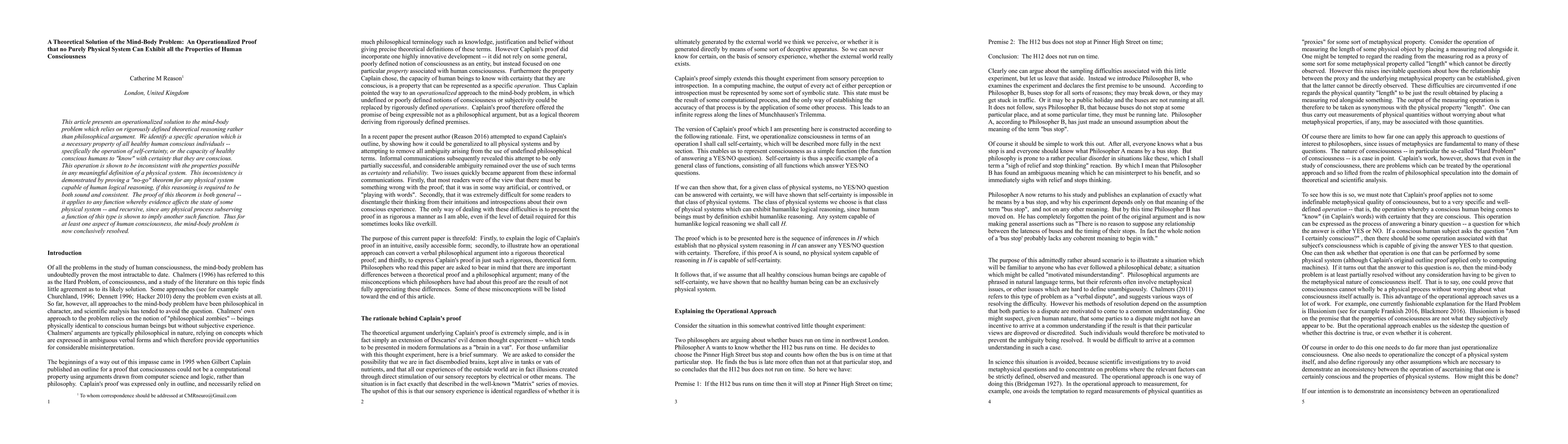 This article presents an operationalized solution to the mind-body problem which relies on rigorously defined theoretical reasoning rather than philosophical argument. We identify a specific operation which is a necessary property of all healthy human conscious individuals -- specifically the operation of self-certainty, or the capacity of healthy conscious humans to "know" with certainty that they are conscious. This operation is shown to be inconsistent with the properties possible in any meaningful definition of a physical system. This inconsistency is demonstrated by proving a "no-go" theorem for any physical system capable of human logical reasoning, if this reasoning is required to be both sound and consistent. The proof of this theorem is both general -- it applies to any function whereby evidence affects the state of some physical system -- and recursive, since any physical process subserving a function of this type is shown to imply another such function. Thus for at least one aspect of human consciousness, the mind-body problem is now conclusively resolved.