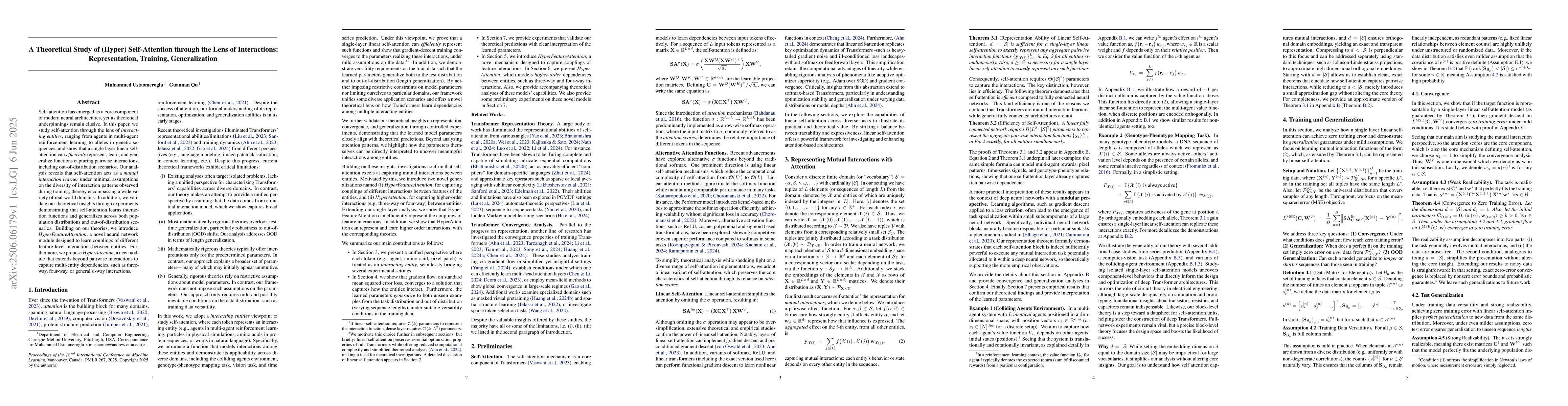 Self-attention has emerged as a core component of modern neural architectures, yet its theoretical underpinnings remain elusive. In this paper, we study self-attention through the lens of interacting entities, ranging from agents in multi-agent reinforcement learning to alleles in genetic sequences, and show that a single layer linear self-attention can efficiently represent, learn, and generalize functions capturing pairwise interactions, including out-of-distribution scenarios. Our analysis reveals that self-attention acts as a mutual interaction learner under minimal assumptions on the diversity of interaction patterns observed during training, thereby encompassing a wide variety of real-world domains. In addition, we validate our theoretical insights through experiments demonstrating that self-attention learns interaction functions and generalizes across both population distributions and out-of-distribution scenarios. Building on our theories, we introduce HyperFeatureAttention, a novel neural network module designed to learn couplings of different feature-level interactions between entities. Furthermore, we propose HyperAttention, a new module that extends beyond pairwise interactions to capture multi-entity dependencies, such as three-way, four-way, or general n-way interactions.