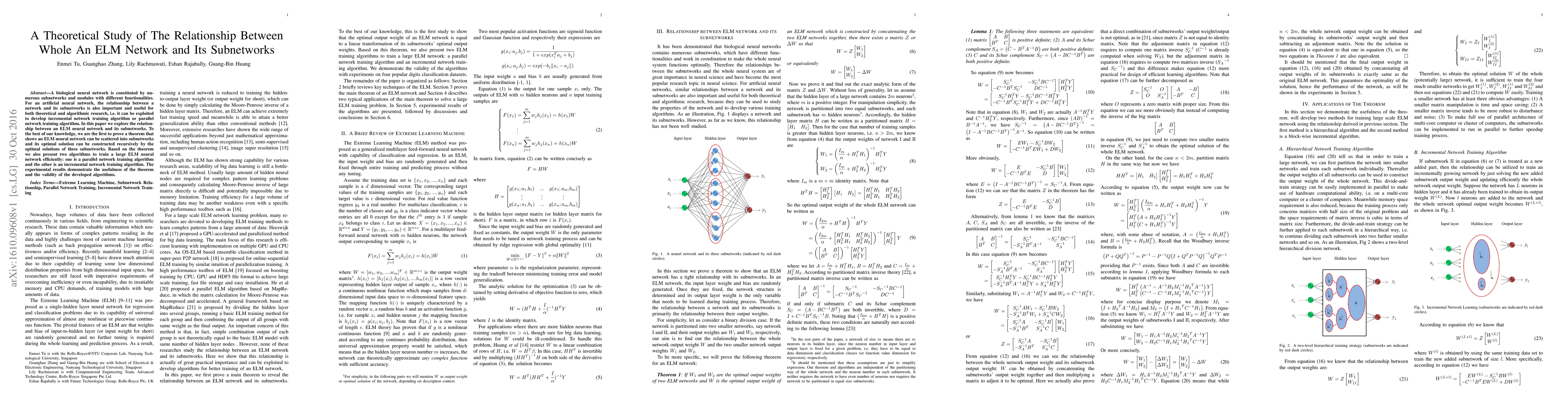 A biological neural network is constituted by numerous subnetworks and modules with different functionalities. For an artificial neural network, the relationship between a network and its subnetworks is also important and useful for both theoretical and algorithmic research, i.e. it can be exploited to develop incremental network training algorithm or parallel network training algorithm. In this paper we explore the relationship between an ELM neural network and its subnetworks. To the best of our knowledge, we are the first to prove a theorem that shows an ELM neural network can be scattered into subnetworks and its optimal solution can be constructed recursively by the optimal solutions of these subnetworks. Based on the theorem we also present two algorithms to train a large ELM neural network efficiently: one is a parallel network training algorithm and the other is an incremental network training algorithm. The experimental results demonstrate the usefulness of the theorem and the validity of the developed algorithms.