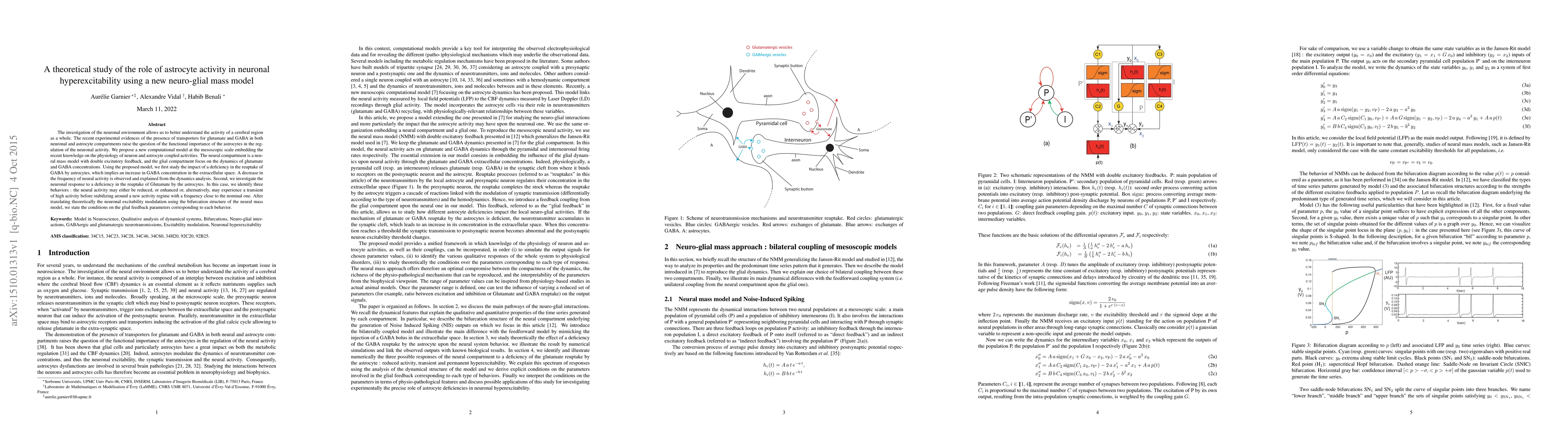 The investigation of the neuronal environment allows us to better understand the activity of a cerebral region as a whole. The recent experimental evidences of the presence of transporters for glutamate and GABA in both neuronal and astrocyte compartments raise the question of the functional importance of the astrocytes in the regulation of the neuronal activity. We propose a new computational model at the mesoscopic scale embedding the recent knowledge on the physiology of neuron and astrocyte coupled activities. The neural compartment is a neural mass model with double excitatory feedback, and the glial compartment focus on the dynamics of glutamate and GABA concentrations. Using the proposed model, we first study the impact of a deficiency in the reuptake of GABA by astrocytes, which implies an increase in GABA concentration in the extracellular space. A decrease in the frequency of neural activity is observed and explained from the dynamics analysis. Second, we investigate the neuronal response to a deficiency in the reuptake of Glutamate by the astrocytes. In this case, we identify three behaviors : the neural activity may either be reduced, or enhanced or, alternatively, may experience a transient of high activity before stabilizing around a new activity regime with a frequency close to the nominal one. After translating theoretically the neuronal excitability modulation using the bifurcation structure of the neural mass model, we state the conditions on the glial feedback parameters corresponding to each behavior.