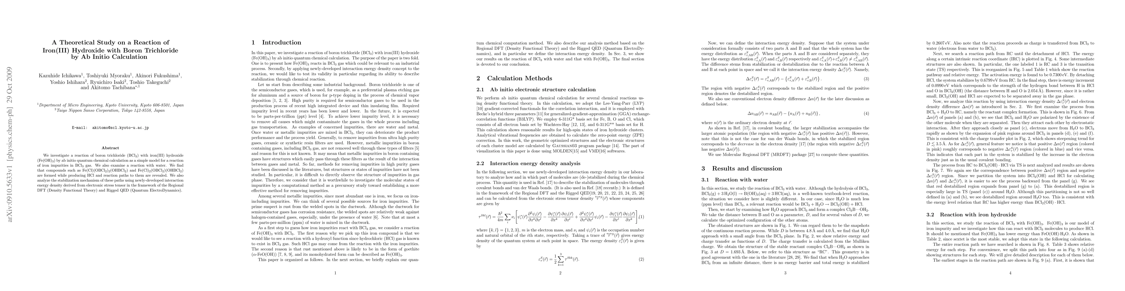 We investigate a reaction of boron trichloride (BCl3) with iron(III) hydroxide (Fe(OH)3) by ab initio quantum chemical calculation as a simple model for a reaction of iron impurities in BCl3 gas. We also examine a reaction with water. We find that compounds such as Fe(Cl)(OBCl2)2(OHBCl2) and Fe(Cl)2(OBCl2)(OHBCl2) are formed while producing HCl and reaction paths to them are revealed. We also analyze the stabilization mechanism of these paths using newly-developed interaction energy density derived from electronic stress tensor in the framework of the Regional DFT (Density Functional Theory) and Rigged QED (Quantum ElectroDynamics).