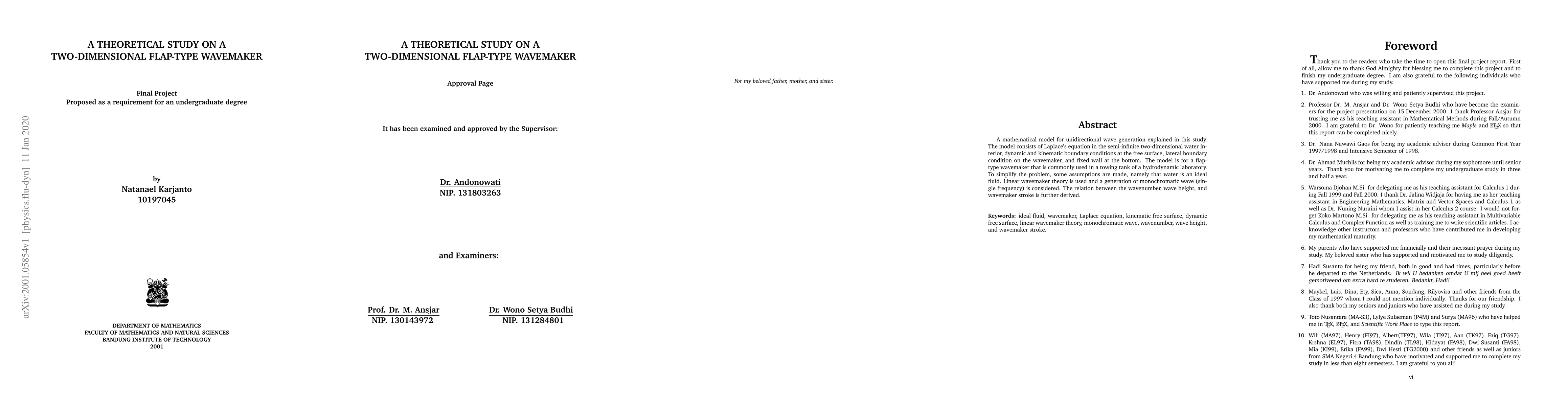 A mathematical model for unidirectional wave generation explained in this study. The model consists of Laplace's equation in the semi-infinite two-dimensional water interior, dynamic and kinematic boundary conditions at the free surface, lateral boundary condition on the wavemaker, and fixed wall at the bottom. The model is for a flap-type wavemaker that is commonly used in a towing tank of a hydrodynamic laboratory. To simplify the problem, some assumptions are made, namely that water is an ideal fluid. Linear wavemaker theory is used and a generation of monochromatic wave (single frequency) is considered. The relation between the wavenumber, wave height, and wavemaker stroke is further derived. -------- Pemodelan secara matematis pembangkitan gelombang arah tunggal disampaikan dalam laporan tugas akhir ini. Pemodelannya mencakup persamaan Laplace dalam kolam air dengan setengah batas tak hingga, syarat batas dinamika dan kinematika, syarat batas lateral di pembangkit gelombang, dan dinding tetap di dasar kolam. Modelnya diterapkan pada pembangkit gelombang (wavemaker) tipe flap yang sering digunakan pada suatu towing tank dalam laboratorium hidrodinamika. Untuk menyederhanakan permasalahan, beberapa asumsi diterapkan, yakni bahwa air adalah fluida yang bersifat ideal. Teori pembangkit gelombang linear digunakan dan tipe gelombang monokromatik (frekuensi tunggal) diamati. Kaitan antara bilangan gelombang, ketinggian gelombang, dan simpangan wavemaker juga akan diturunkan.