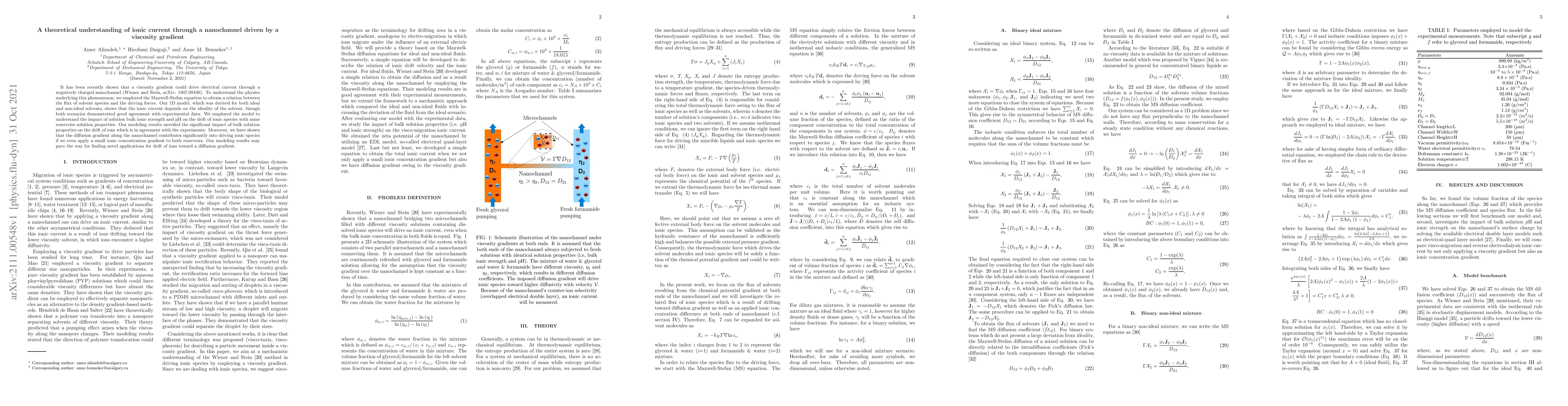 This paper explores the ionic current through a nanochannel driven by a viscosity gradient, using the Maxwell-Stefan equation to model the phenomenon. The study reveals that the ionic current is influenced by the solvent's ideality, and bulk solution properties significantly affect ion drift, with small concentration gradients enhancing ionic movement.