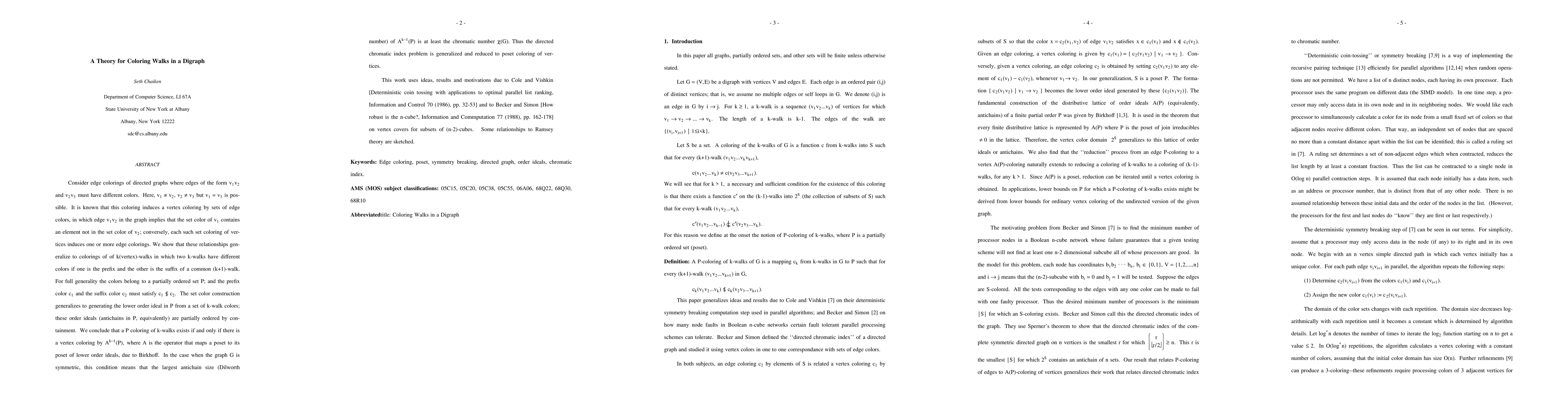 Consider edge colorings of digraphs where edges $v_1 v_2$ and $v_2 v_3$ have different colors. This coloring induces a vertex coloring by sets of edge colors, in which edge $v_1 v_2$ in the graph implies that the set color of $v_1$ contains an element not in the set color of $v_2$, and conversely. We generalize to colorings of $k$(vertex)-walks, defined so two walks have different colors if one is the prefix $c_1$ and the other is the suffix $c_2$ of a common $(k+1)$-walk. Further, the colors can belong to a poset $P$ where $c_1$, $c_2$ must satisfy $c_1 \not\leq c_2$. This set construction generalizes the lower order ideal in $P$ from a set of $k$-walk colors; these order ideals are partially ordered by containment. We conclude that a $P$ coloring of $k$-walks exists iff there is a vertex coloring by $A$ iterated $k-1$ times on $P$, where Birkhoff's $A$ maps a poset to its poset of lower order ideals. Thus the directed chromatic index problem is generalized and reduced to poset coloring of vertices. This work uses ideas, results and motivations due to Cole and Vishkin on deterministic coin tossing and Becker and Simon on vertex covers for subsets of $(n-2)$-cubes.