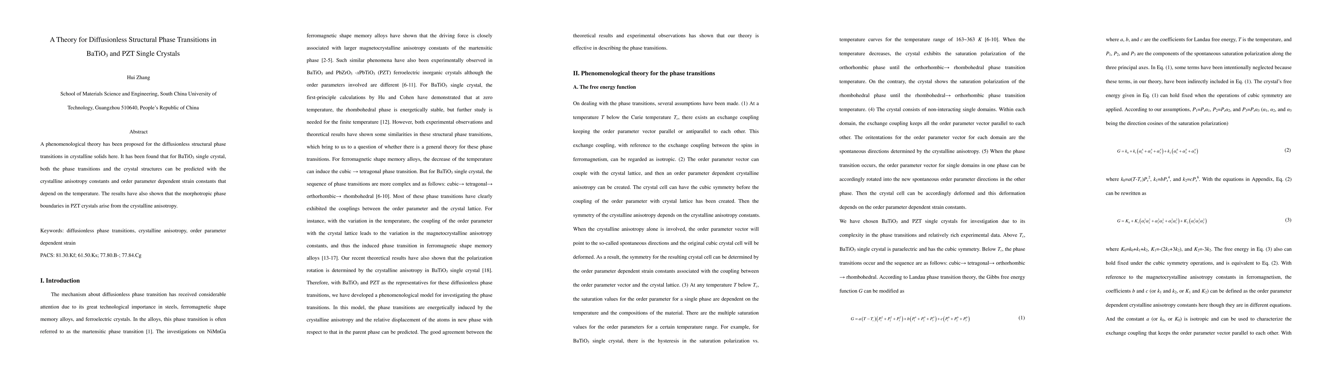 This paper proposes a phenomenological theory for diffusionless phase transitions in BaTiO3 and PZT single crystals, showing that these transitions can be predicted using crystalline anisotropy constants and temperature-dependent strain constants. The morphotropic phase boundaries in PZT are attributed to crystalline anisotropy.
