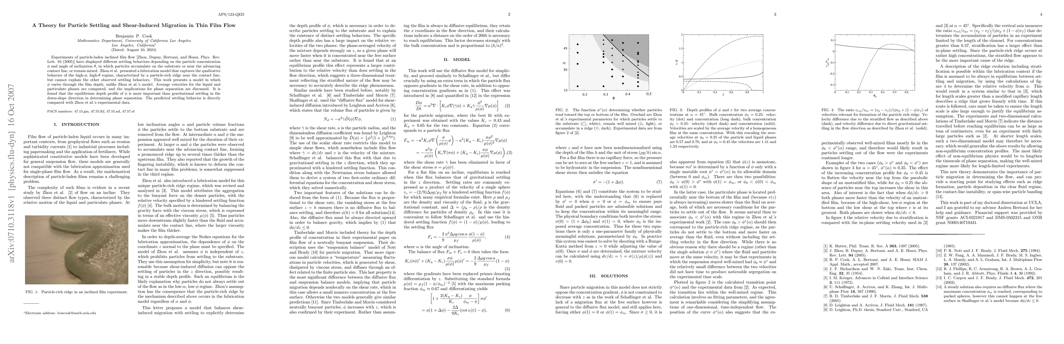 This paper develops a new model for particle settling and shear-induced migration in thin film flow, showing that varying particle concentration through film depth better explains diverse settling behaviors compared to previous models. It emphasizes the importance of equilibrium depth profile of particle concentration over gravitational settling in determining phase separation.