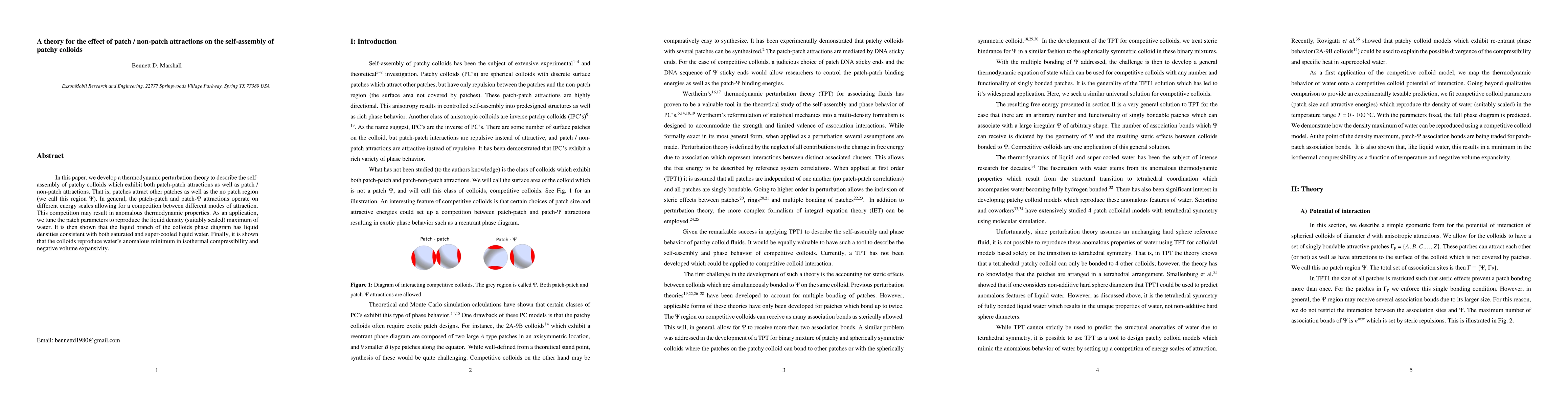 This paper presents a thermodynamic perturbation theory to explain the self-assembly of patchy colloids with both patch-patch and patch/non-patch attractions, revealing controlled assembly and anomalous phase behavior. The model is applied to study liquid water, demonstrating its potential application.