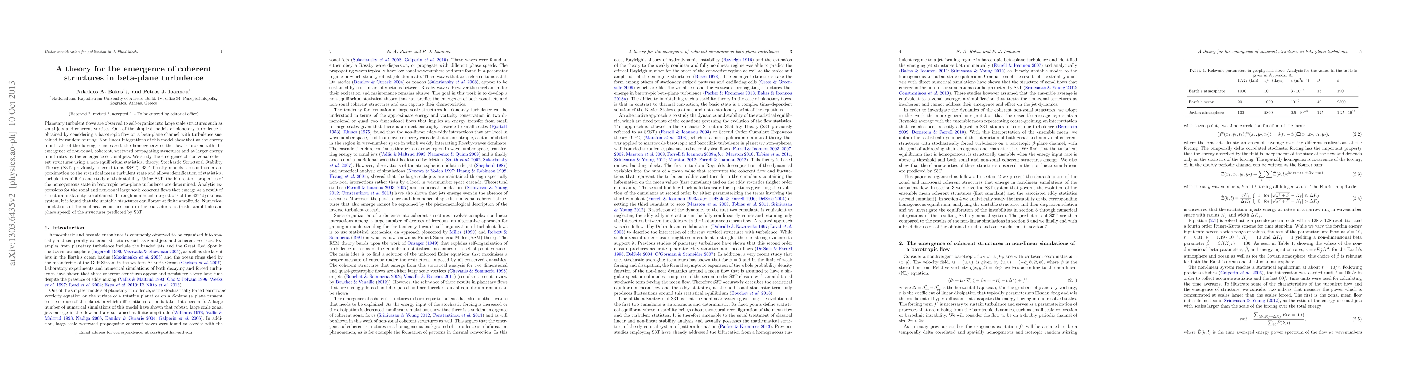 This paper develops Stochastic Structural Stability Theory (S3T) to analyze the emergence of coherent structures in beta-plane turbulence, showing that increased energy input leads to the formation of non-zonal, westward propagating structures and zonal jets, with numerical simulations validating the theory's predictions.